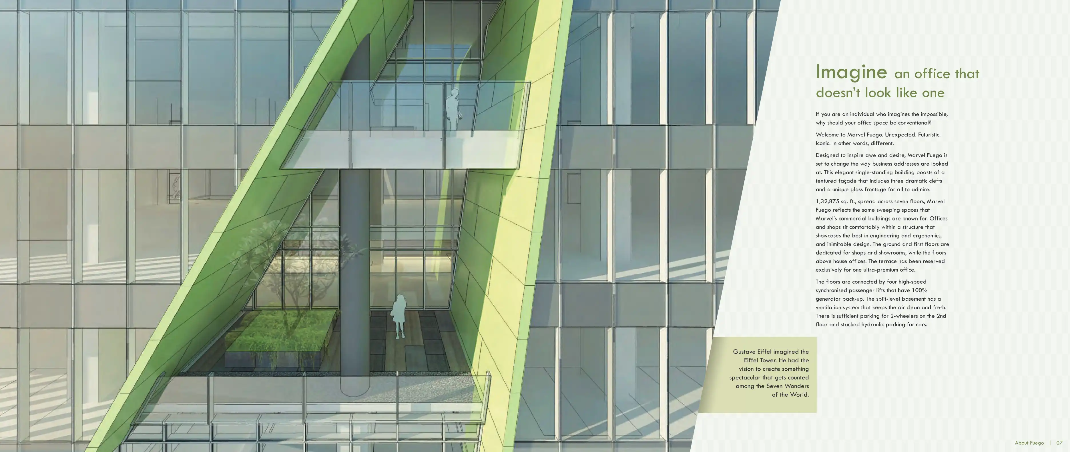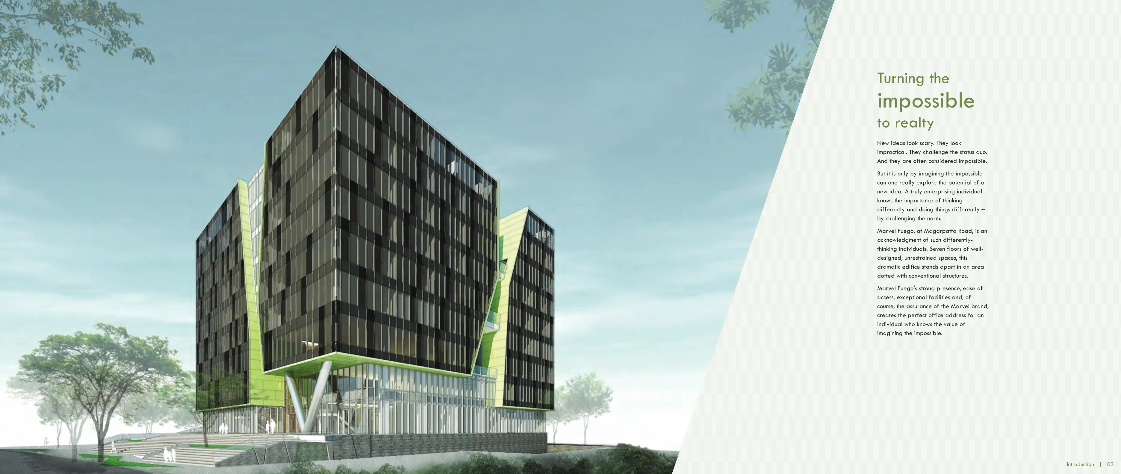 Marvel Fuego, at Magarpatta Road, is an acknowledgment of such differently-thinking individuals. Seven floors of well-designed, unrestrained spaces, this dramatic edifice stands apart in an area dotted with conventional structures.