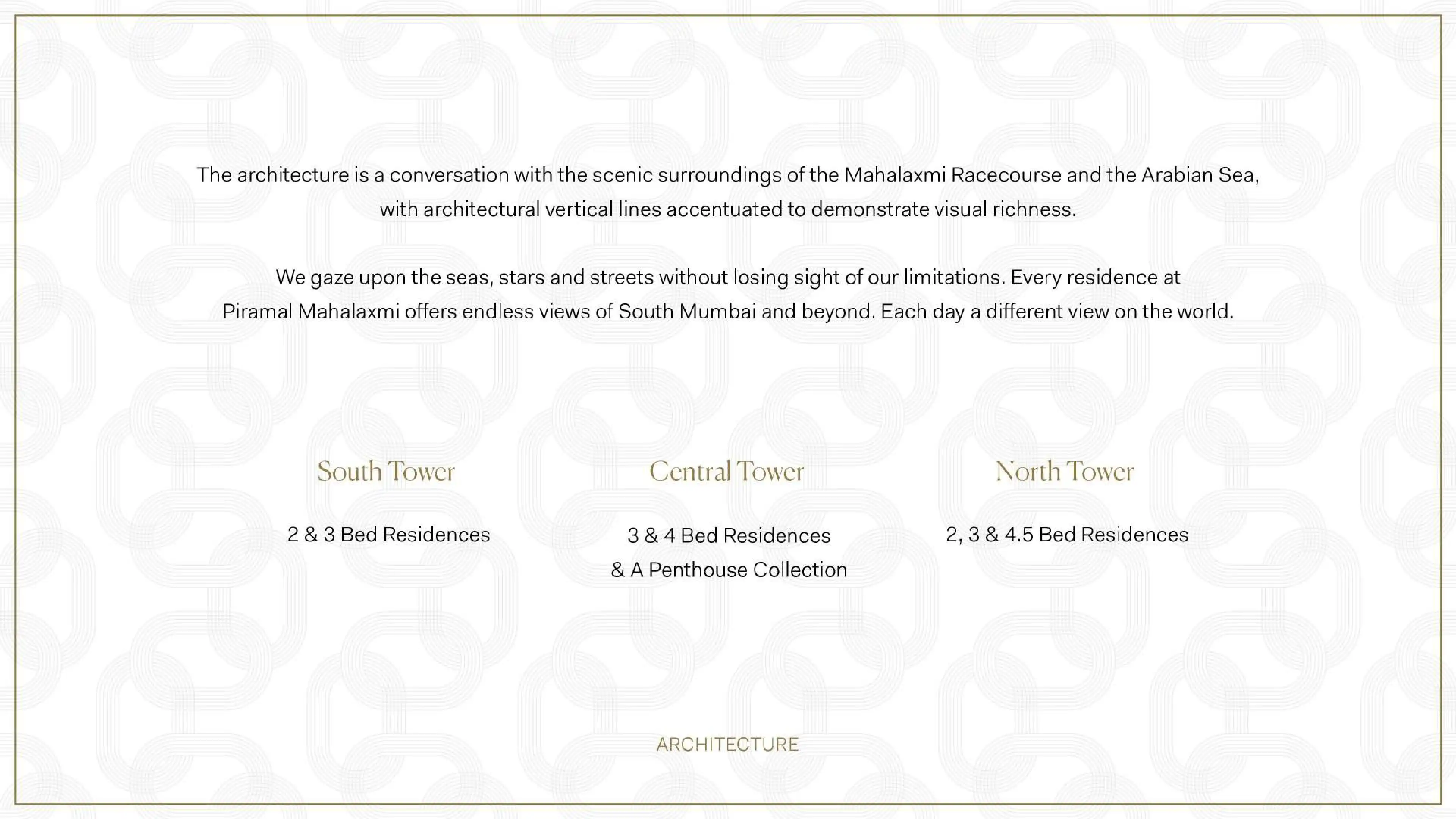 Piramal Mahalaxmi is a landmark development of greatest glory. It embodies the spirit of Mahalaxmi and mirrors South Mumbai's essence with its three phenomenal towers.