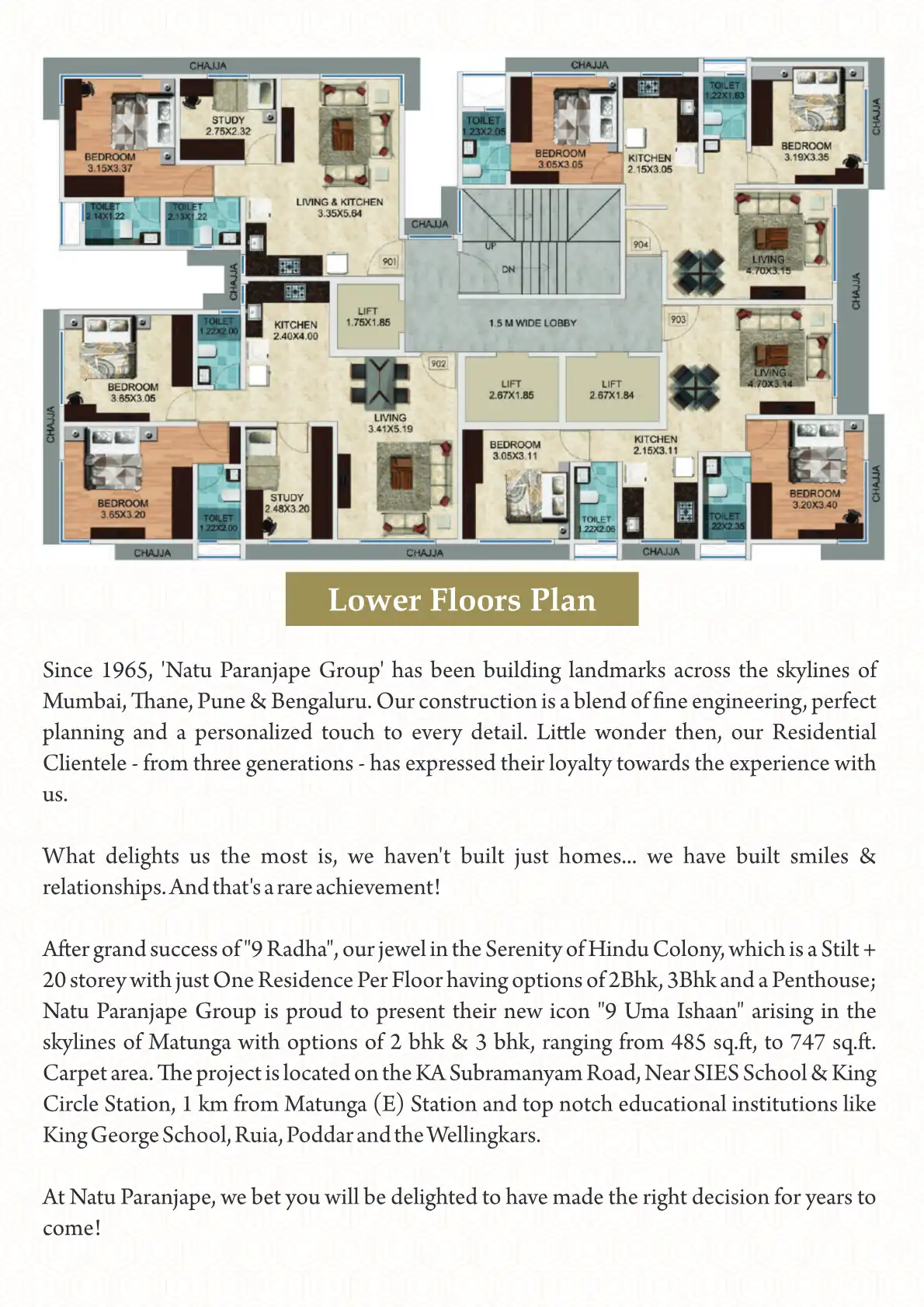 Natu Paranjape Group is proud to present their new icon "9 Uma Ishaan" arising in the skylines of Matunga with options of 2 bhk & 3 bhk, ranging from 485 sq.ft, to 747 sq.ft. Carpet area.
