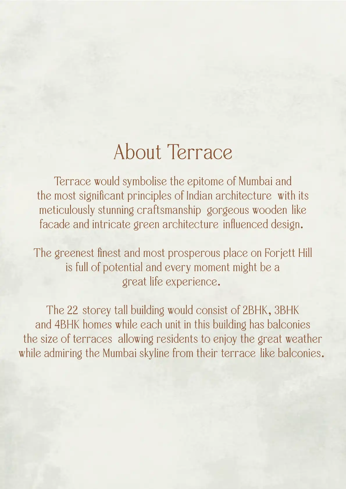 Terrace would symbolise the epitome of Mumbai and the most significant principles of Indian architecture with its meticulously stunning craftsmanship gorgeous wooden like facade and intricate green architecture influenced design.
