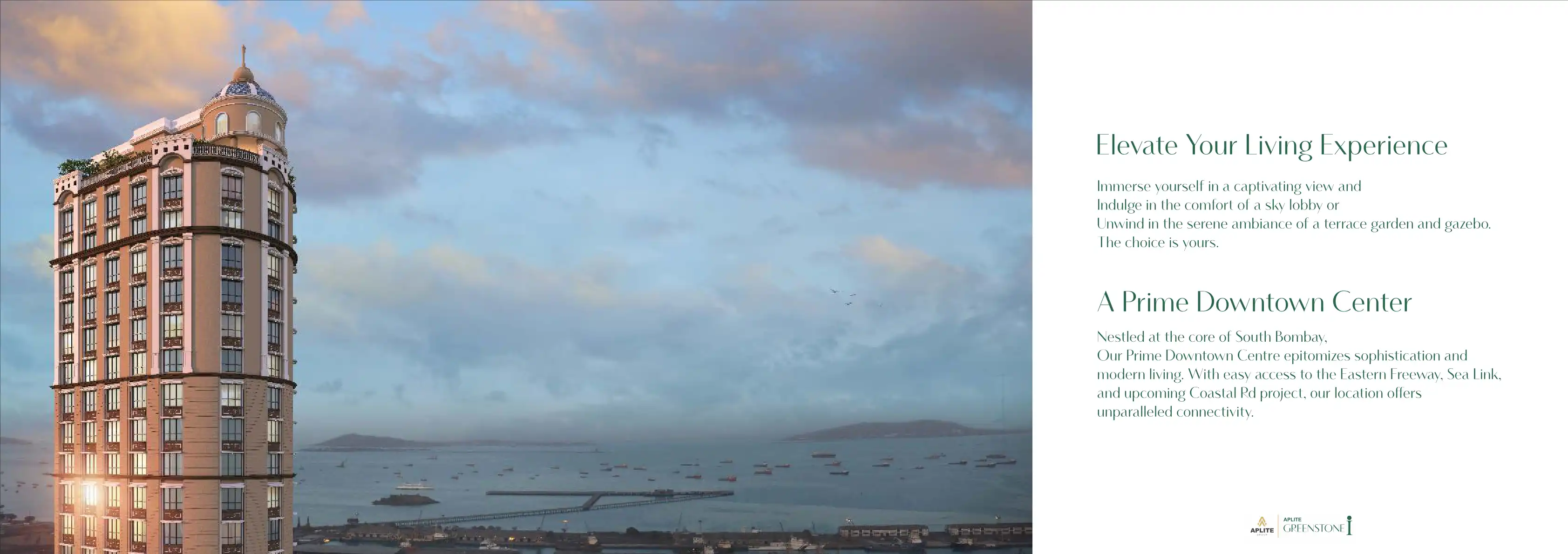 Aplite Greenstone I is a residential project located in Fort, Mumbai. The project offers well-furnished flats, luxurious amenities, and breathtaking vistas. It provides easy access to the Eastern Freeway, Sea Link, and upcoming Coastal Rd project.
