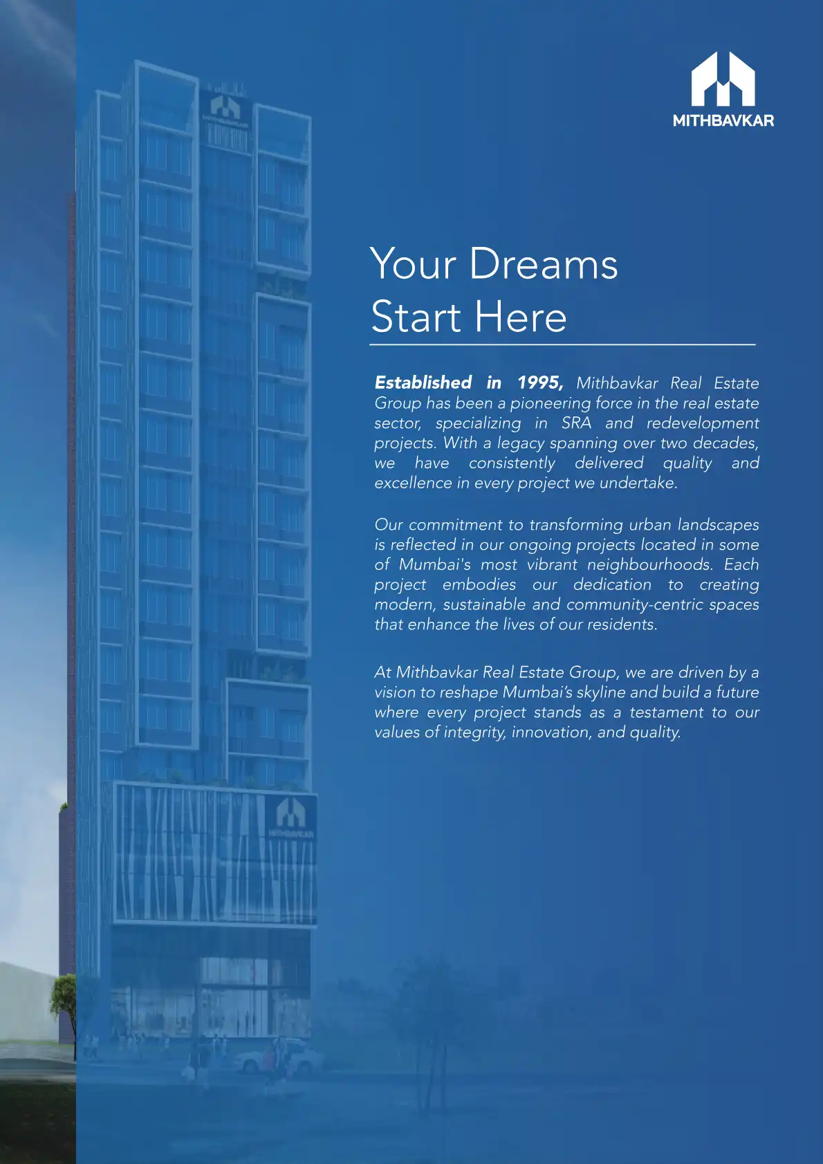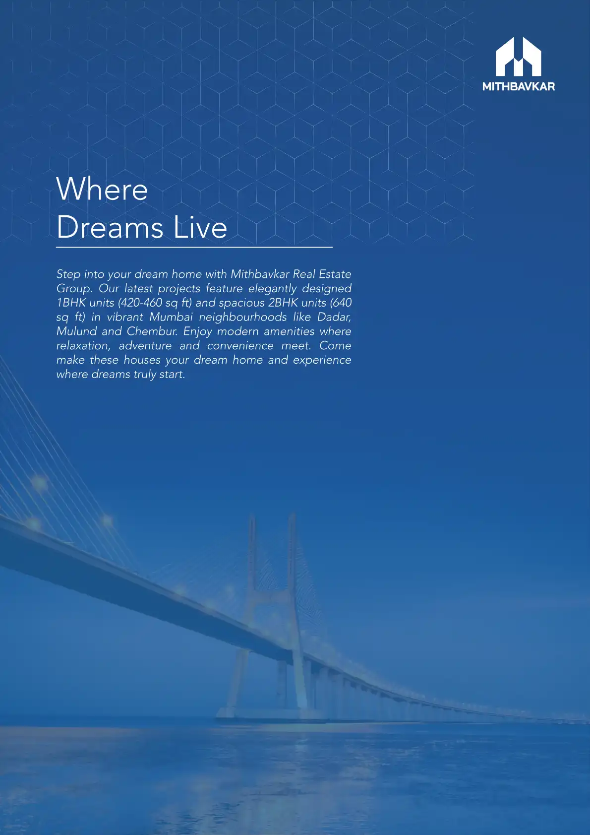 Step into your dream home with Mithbavkar Real Estate Group. Our latest projects feature elegantly designed 1BHK units (420-460 sq ft) and spacious 2BHK units (640 sq ft) in vibrant Mumbai neighbourhoods like Dadar, Mulund and Chembur. Enjoy modern a...