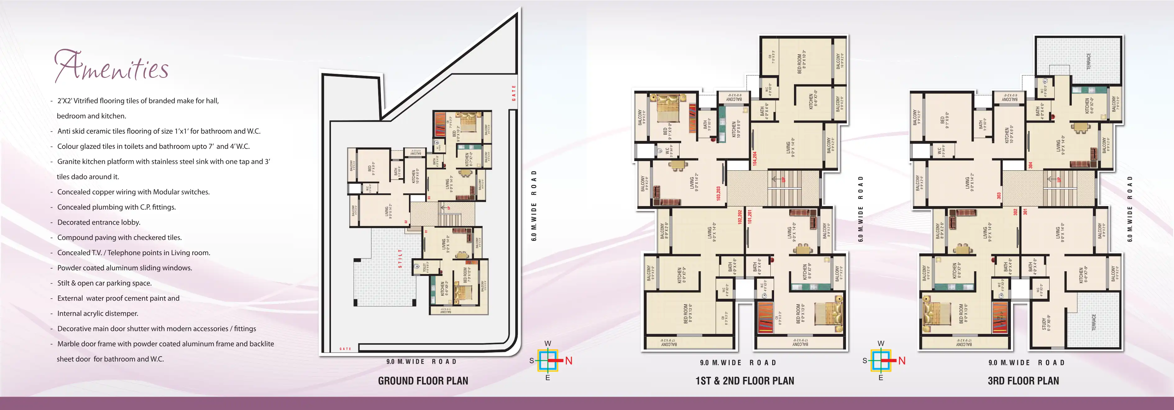 2'X2' Vitrified flooring tiles of branded make for hall, bedroom and kitchen. Granite kitchen platform with stainless steel sink with one tap and 3' Colour glazed tiles in toilets and bathroom upto 7' and 4'W.C. Anti skid ceramic tiles flooring of si...