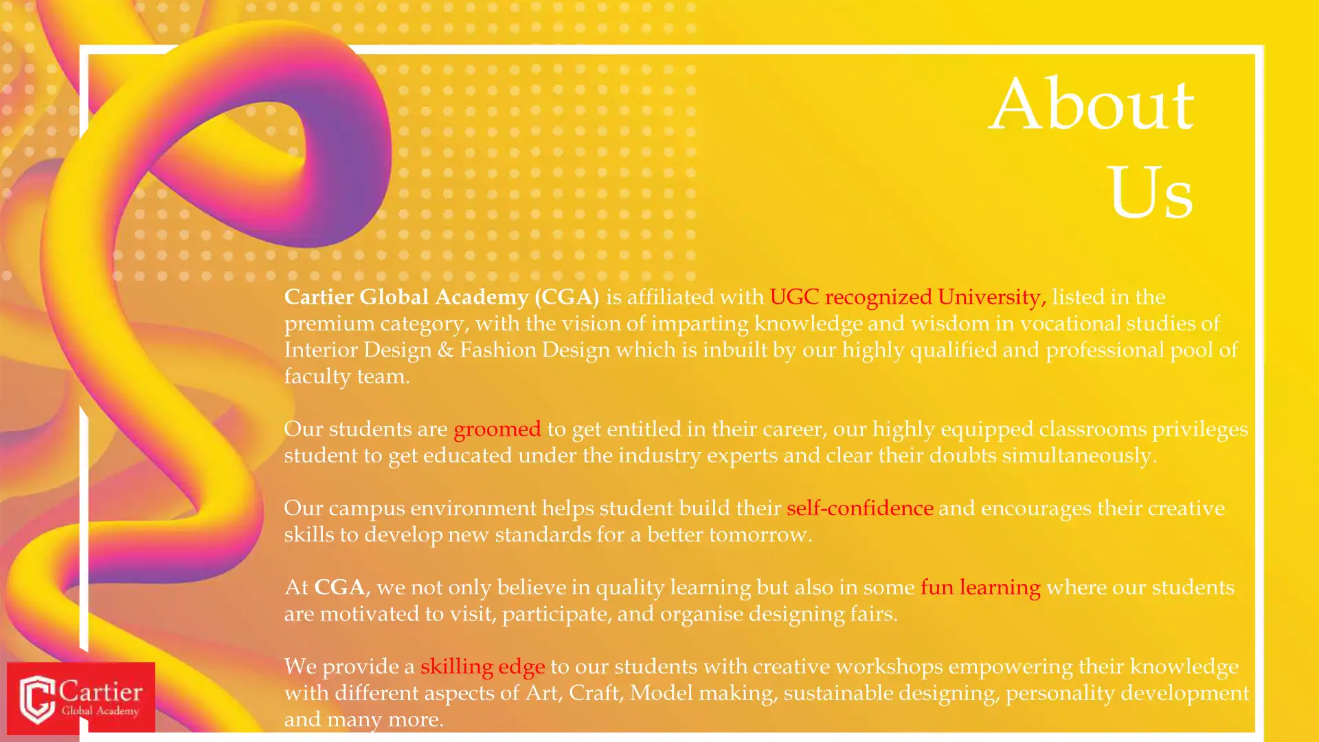 Cartier Global Academy (CGA) is affiliated with UGC recognized University, listed in the premium category, with the vision of imparting knowledge and wisdom in vocational studies of Interior Design & Fashion Design which is inbuilt by our highly qua...