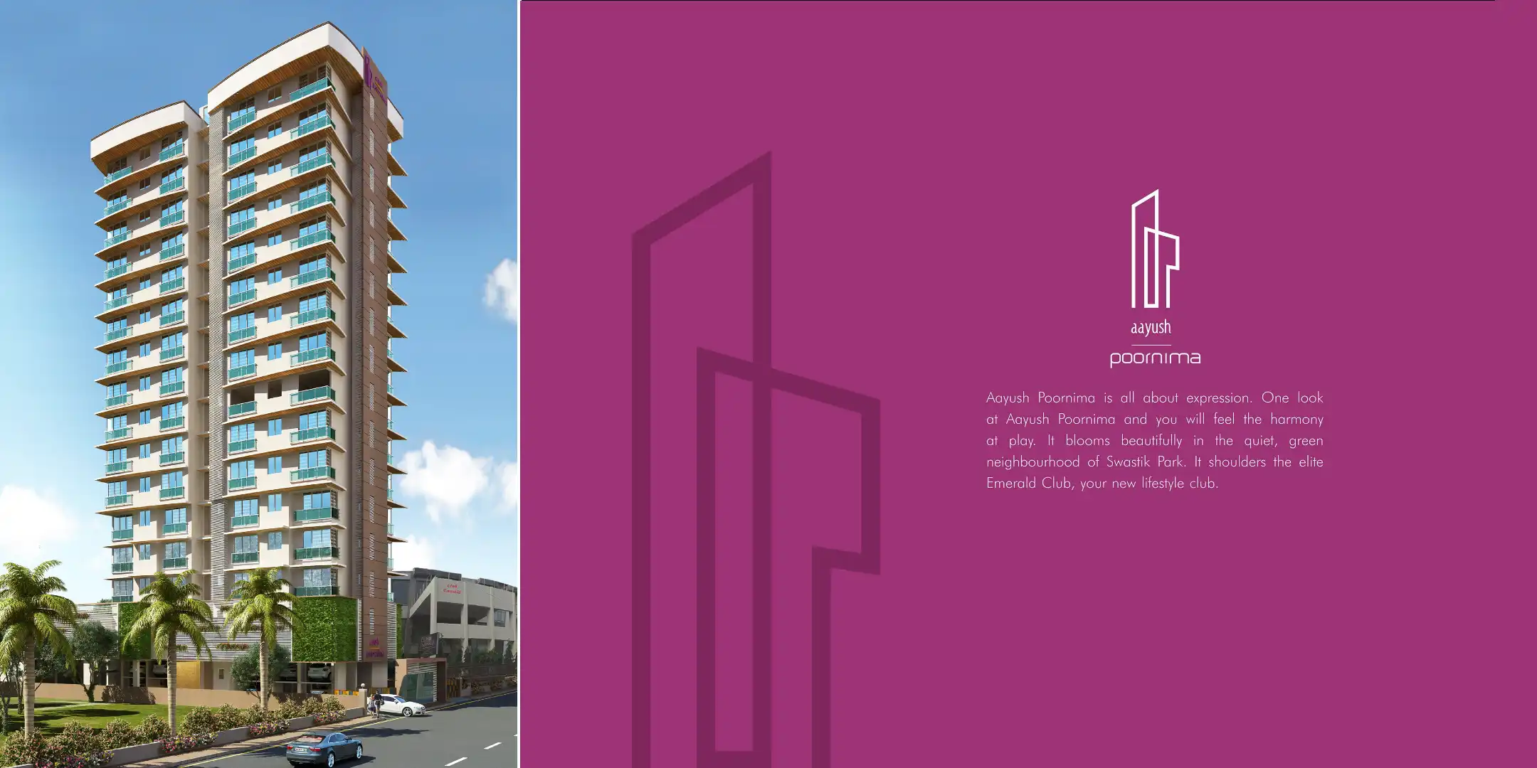 Aayush Poornima is all about expression. One look at Aayush Poornima and you will feel the harmony at play. It blooms beautifully in the quiet, green neighbourhood of Swastik Park. It shoulders the elite Emerald Club, your new lifestyle club.