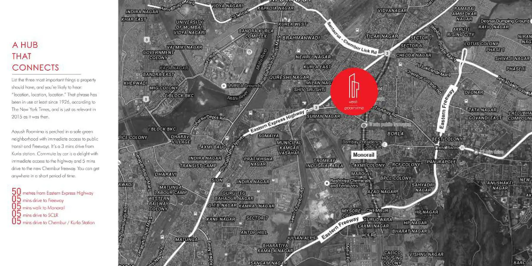 Kurla East is strategically located near significant commercial hubs. Equinox Business Park in Kurla and Platina BKC are major employment centers. The area also benefits from its proximity to the Chembur Business District and Bandra Kurla Complex (BKC), offering numerous job opportunities and making it a convenient location for professionals.