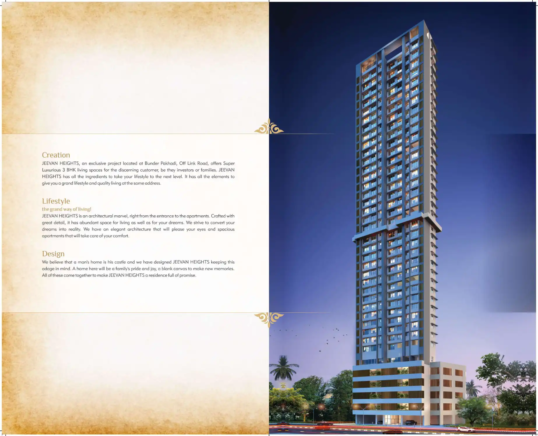 JEEVAN HEIGHTS, an exclusive project located at Bunder Pakhadi, Off Link Road, offers Super Luxurious 3 BHK living spaces for the discerning customer, be they investors or families. JEEVAN HEIGHTS has all the ingredients to take your lifestyle to the...