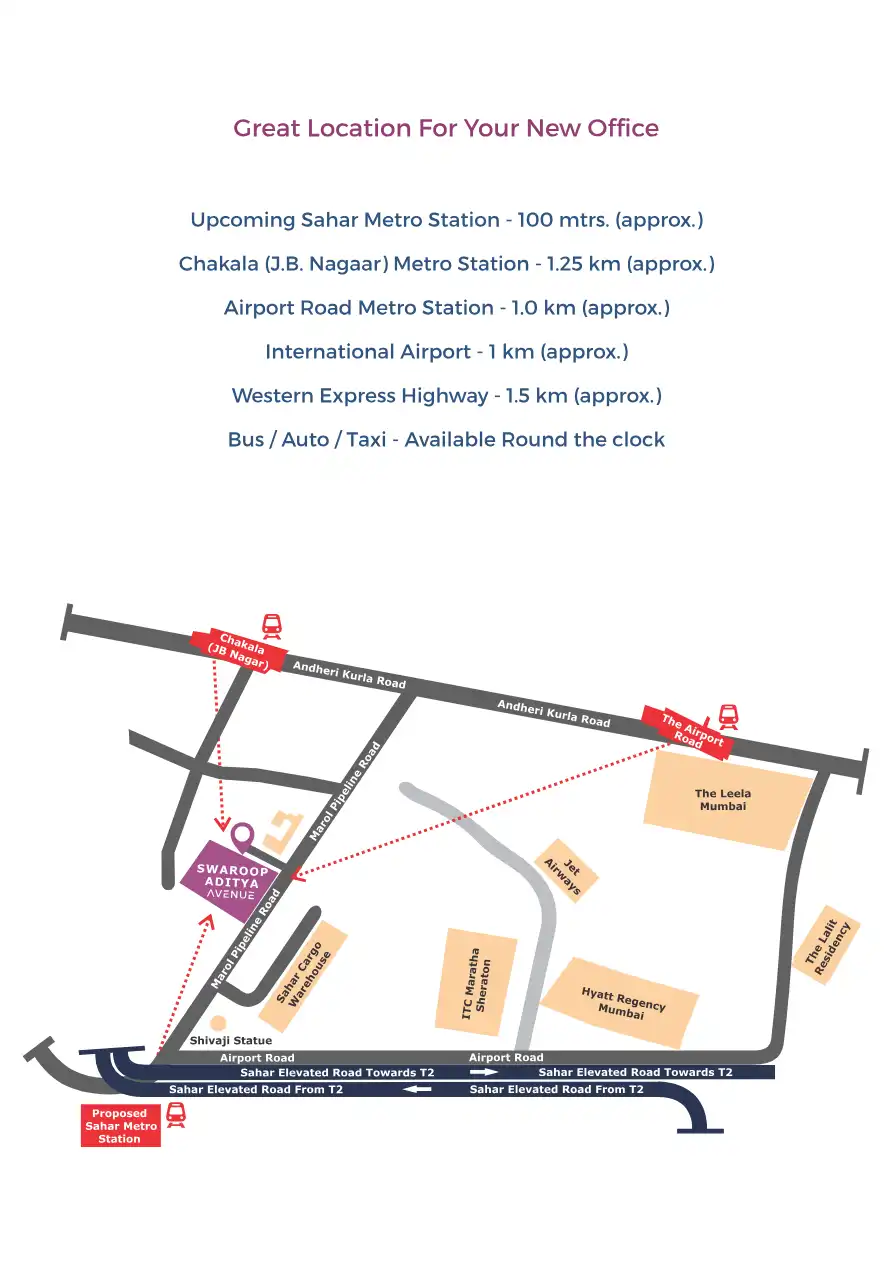 Swaroop Aditya Avenue is a commercial project in Andheri East, Mumbai. It is located near the upcoming Sahar Metro Station and offers office spaces.