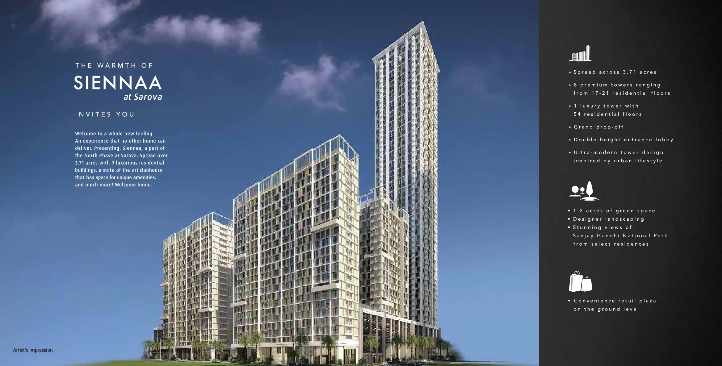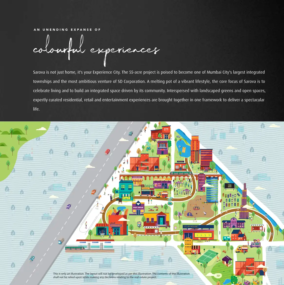 Sarova is not just home, it's your Experience City. The 55-acre project is poised to become one of Mumbai City's largest integrated townships and the most ambitious venture of SD Corporation. A melting pot of a vibrant lifestyle, the core focus of Sa...