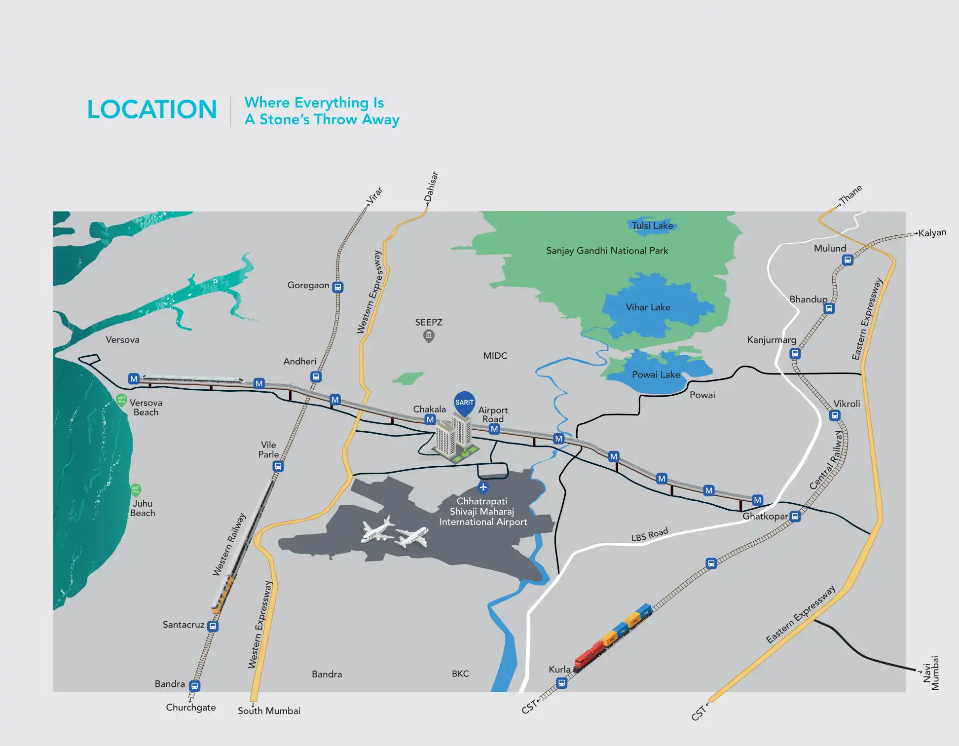 JB Nagar boasts excellent connectivity. It is well-served by the Mumbai Metro, with Airport Road Metro Station, Western Express Highway Metro Station, and Gundavali Metro Station in close proximity. The Western Express Highway provides seamless road connectivity, and the Chhatrapati Shivaji Maharaj International Airport is just a short drive away, offering convenient travel options.