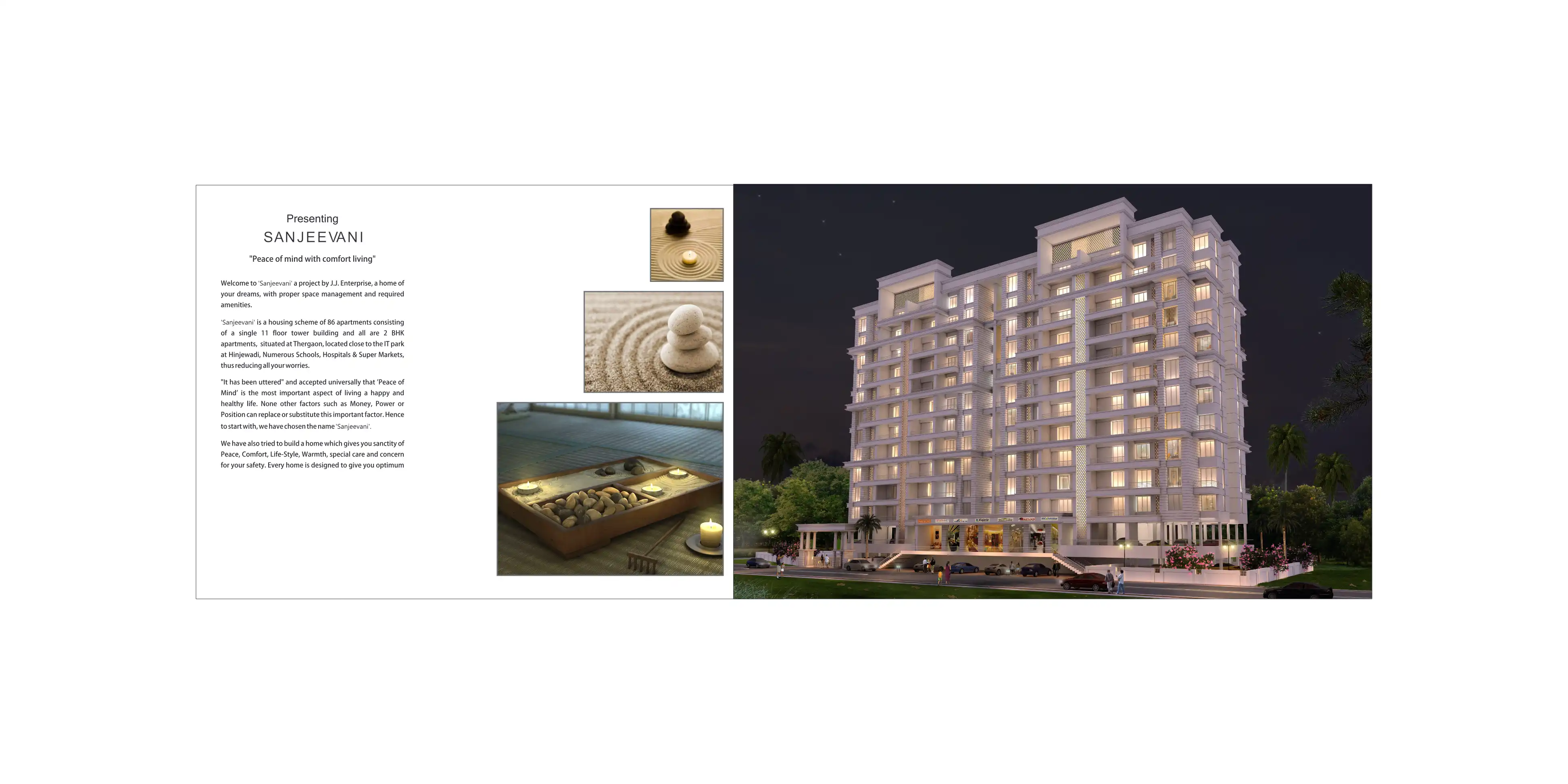 Sanjeevani is a housing scheme of 86 apartments consisting of a single 11 floor tower building and all are 2 BHK apartments, situated at Thergaon, located close to the IT park at Hinjewadi