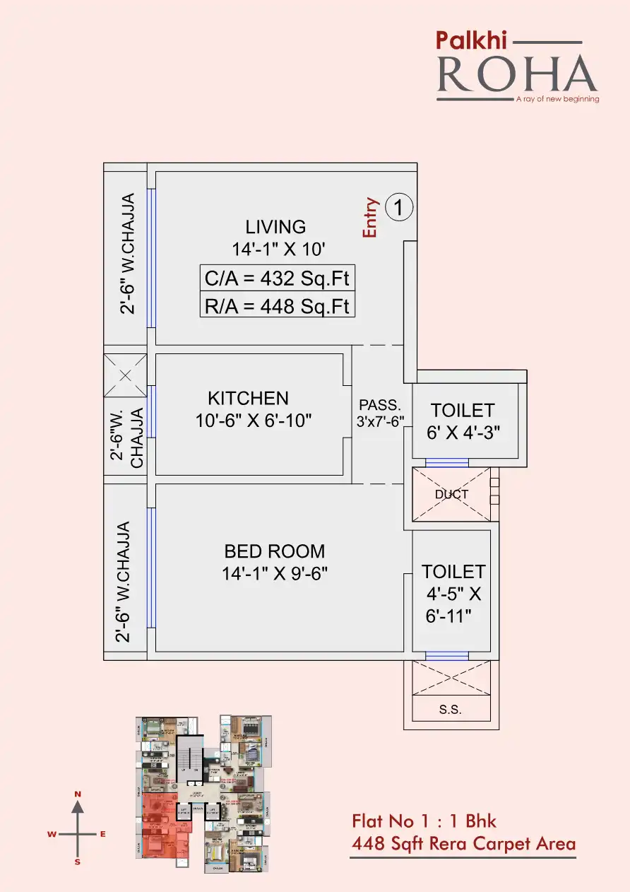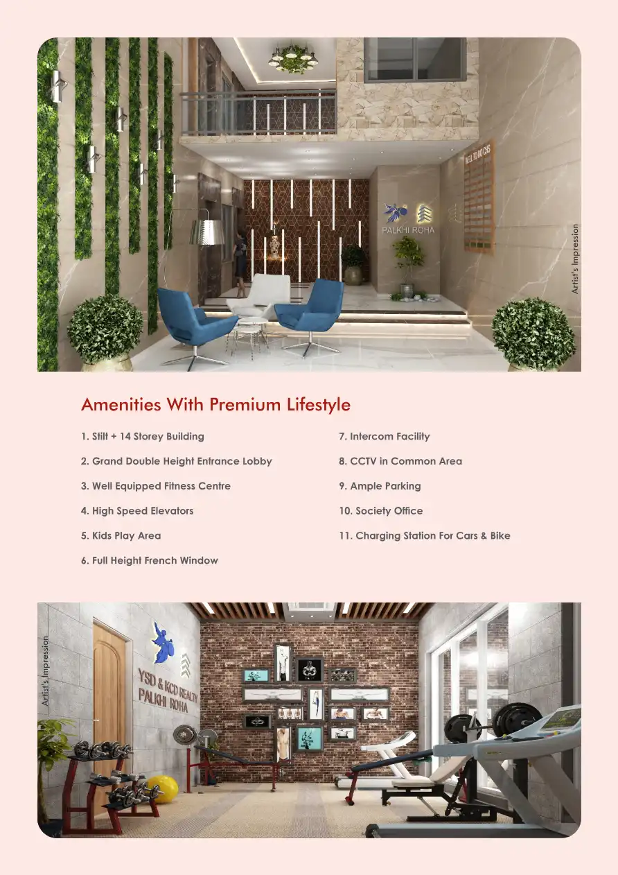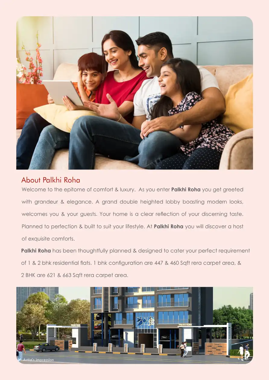 Palkhi Roha has been thoughtfully planned & designed to cater your perfect requirement of 1 & 2 bhk residential flats. 1 bhk configuration are 447 & 460 Sqft rera carpet area, & 2 BHK are 621 & 663 Sqft rera carpet area.