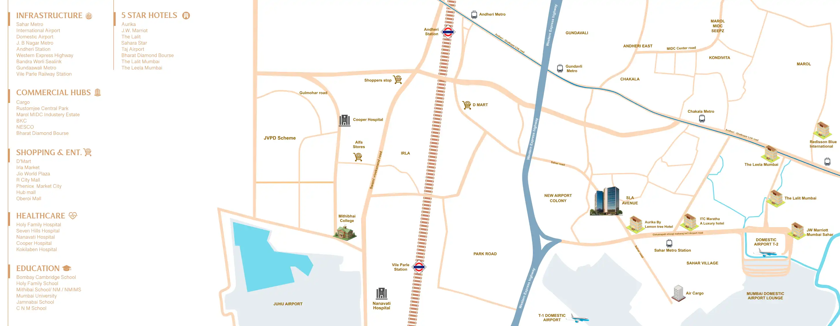 Chakala boasts robust connectivity with the Western Express Highway and Andheri-Kurla Road. It is well-served by the Mumbai Metro, with stations like Gundavali Metro Station and Western Express Highway Metro Station nearby. Andheri Railway Station, a major suburban rail hub, is also easily accessible, enhancing commute options.