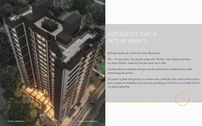 Sai Krupa stands tall on Borivali's iconic Eksar Road.Stilt + 18 storeyed up. Two majestic wings with 104 flats, that welcome you home to a divine lifestyle, amidst the best that nature has to offer. 3 exclusive flats on each floor, that give you the...