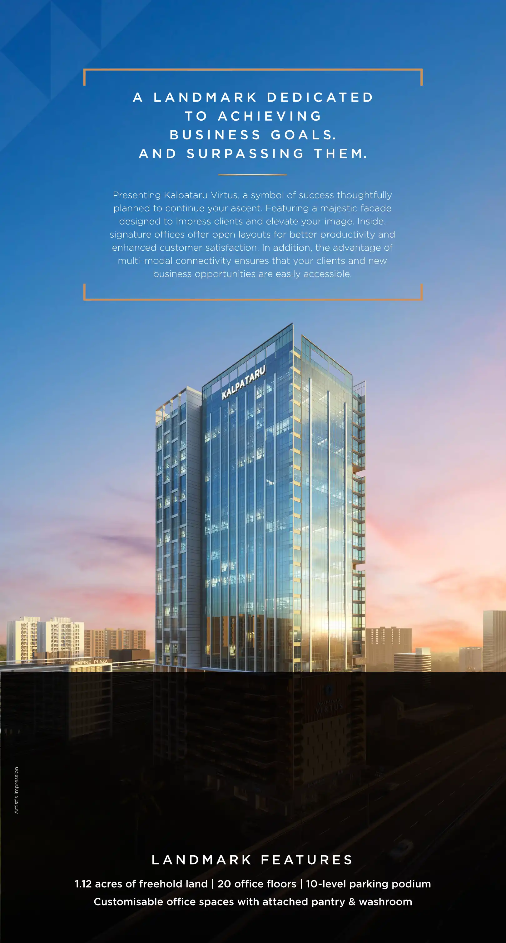 Presenting Kalpataru Virtus, a symbol of success thoughtfully planned to continue your ascent. Featuring a majestic facade designed to impress clients and elevate your image. Inside, signature offices offer open layouts for better productivity and en...