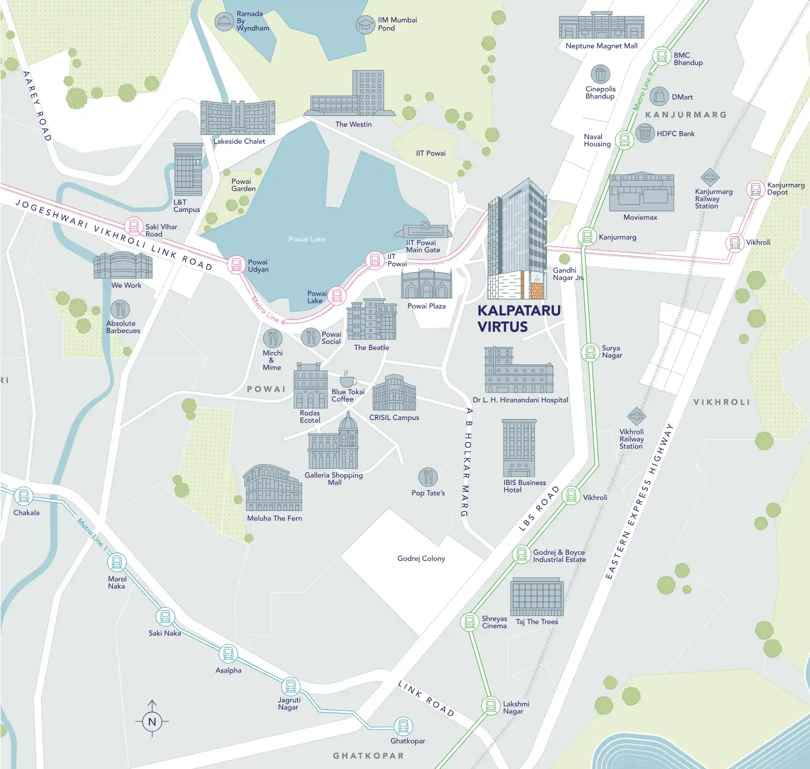 Yes, LBS Marg is strategically located near several prominent commercial and IT hubs. Powai, with its Hiranandani Business Park and Knowledge Park, is a major employment center. Other areas like Vikhroli and Kanjurmarg also host numerous corporate offices and industrial estates, making it a convenient location for professionals seeking proximity to their workplaces.