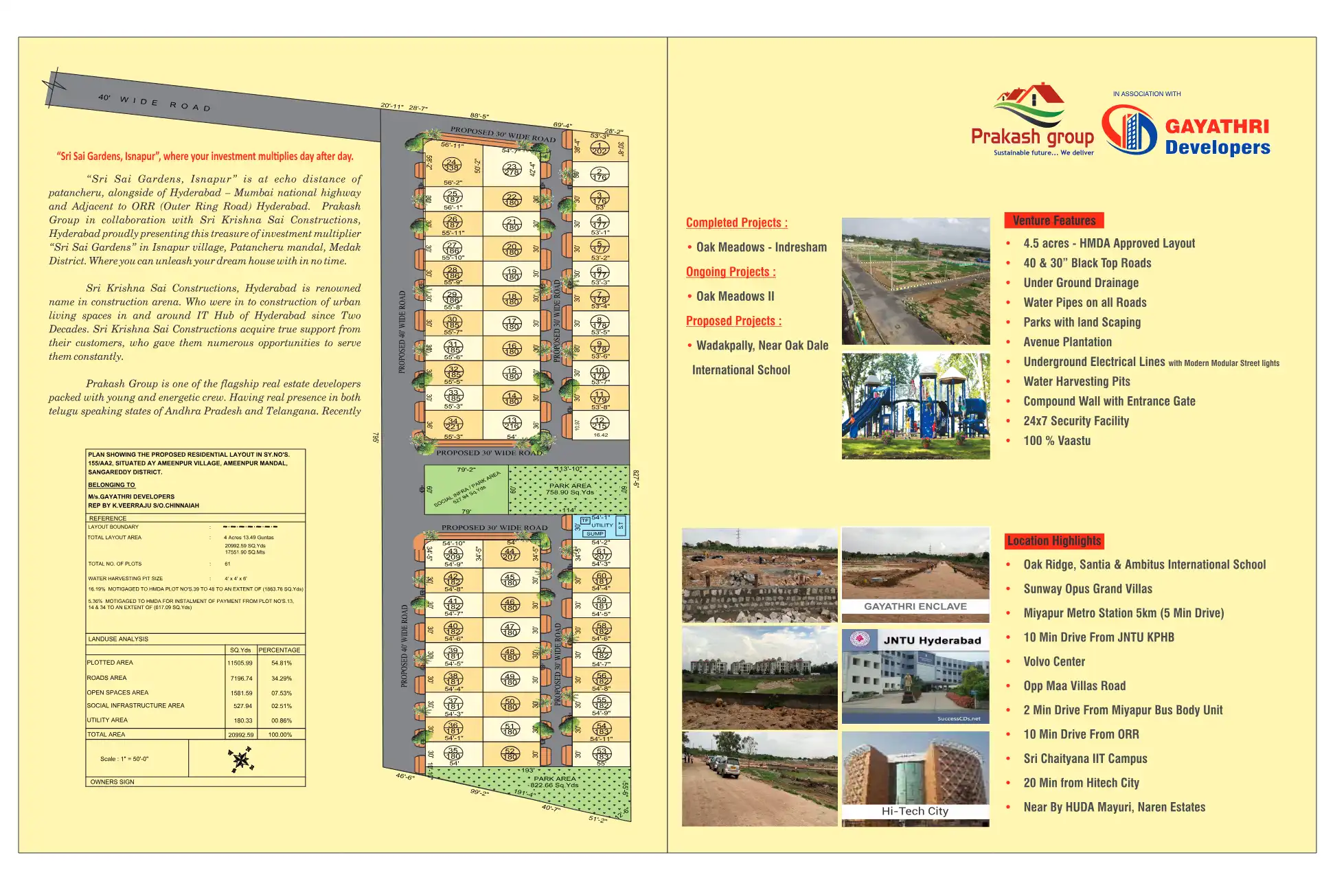 "Sri Sai Gardens, Isnapur" is at echo distance of patancheru, alongside of Hyderabad - Mumbai national highway and Adjacent to ORR (Outer Ring Road) Hyderabad. Prakash Group in collaboration with Sri Krishna Sai Constructions, Hyderabad proudly prese...