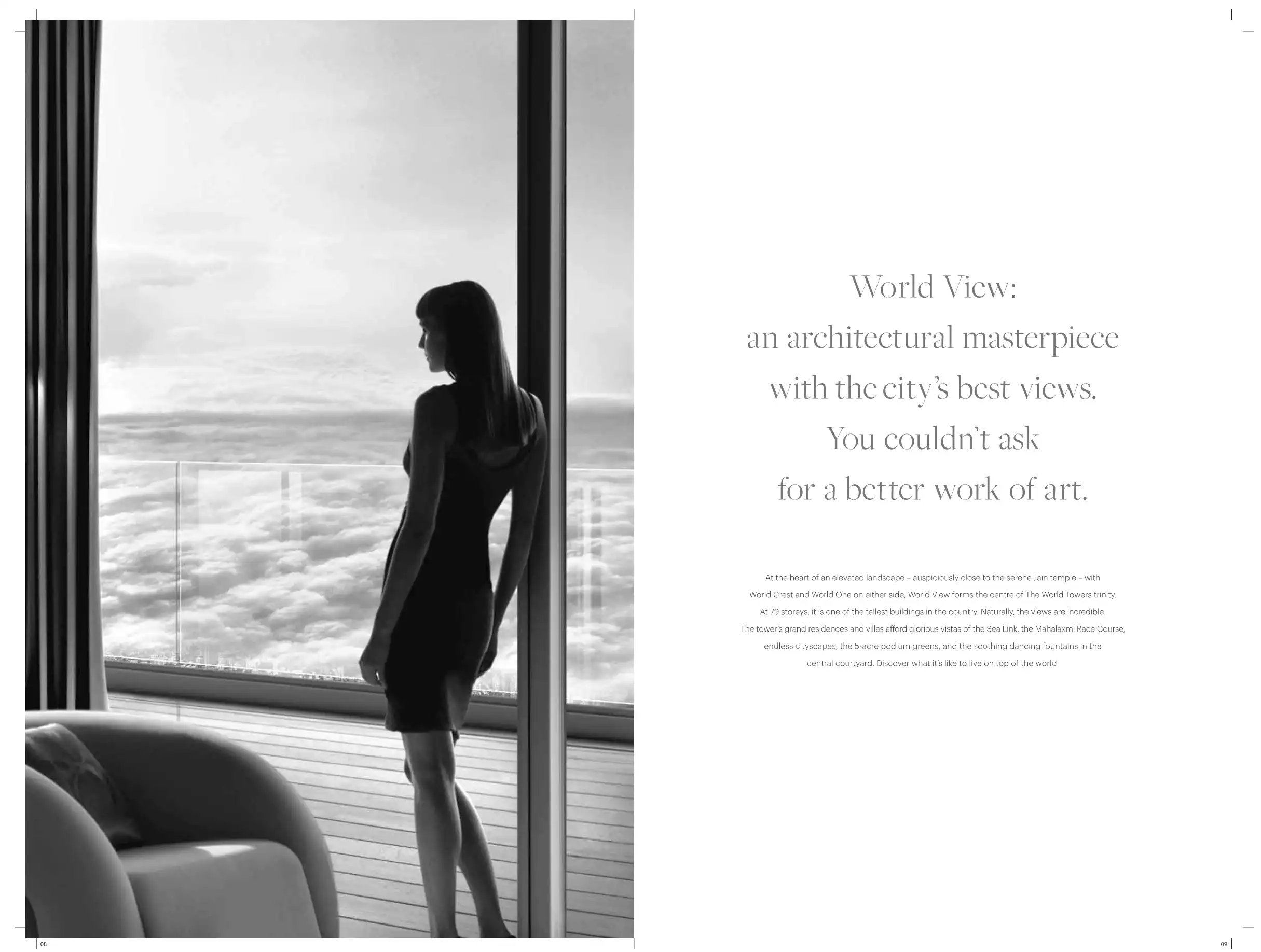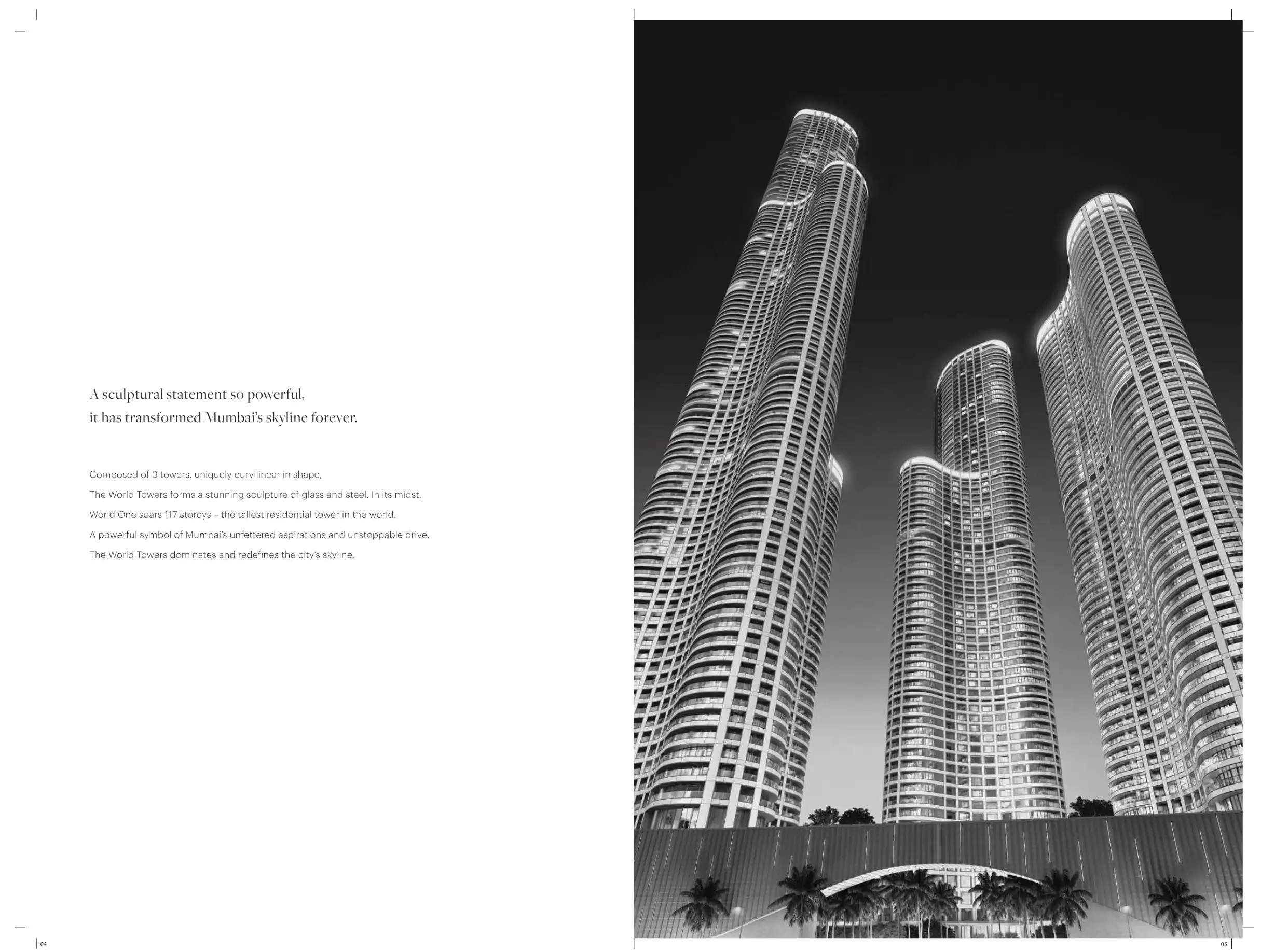 Presenting The World Towers, India's Global Icon. The World Towers forms a stunning sculpture of glass and steel. World View: an architectural masterpiece with the city's best views. The final tower. Designed to be the city's next landmark.