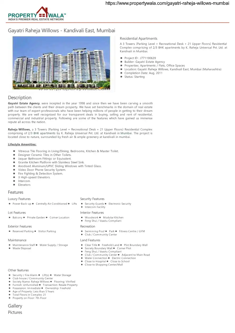 Raheja Willows, a 3 Towers (Parking Level + Recreational Desk + 21 Upper Floors) Residential Complex comprising of 2/3 BHK apartments by K. Raheja Universal Pvt. Ltd. at Kandivali in Mumbai. The project is located close to nature, surrounded by fresh...