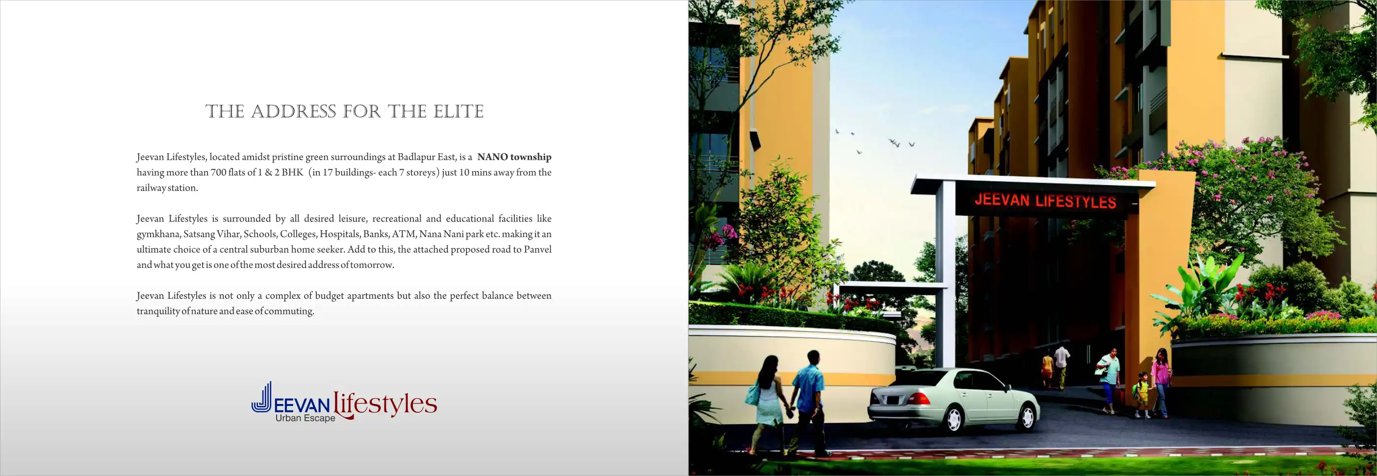 Jeevan Lifestyles, located amidst pristine green surroundings at Badlapur East, is a NANO township having more than 700 flats of 1 & 2 BHK (in 17 buildings- each 7 storeys) just 10 mins away from the railway station.