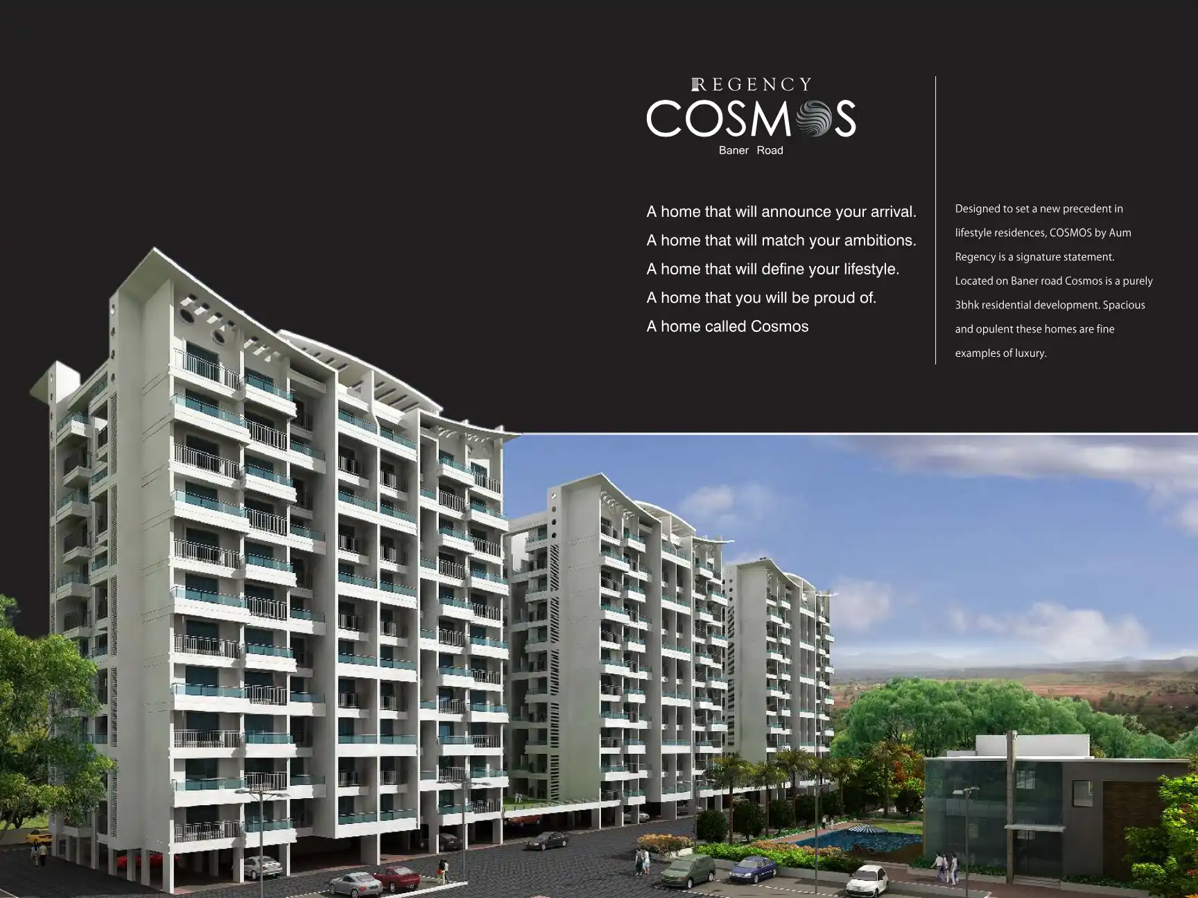Designed to set a new precedent in lifestyle residences, COSMOS by Aum Regency is a signature statement. Located on Baner road Cosmos is a purely 3bhk residential development. Spacious and opulent these homes are fine examples of luxury.