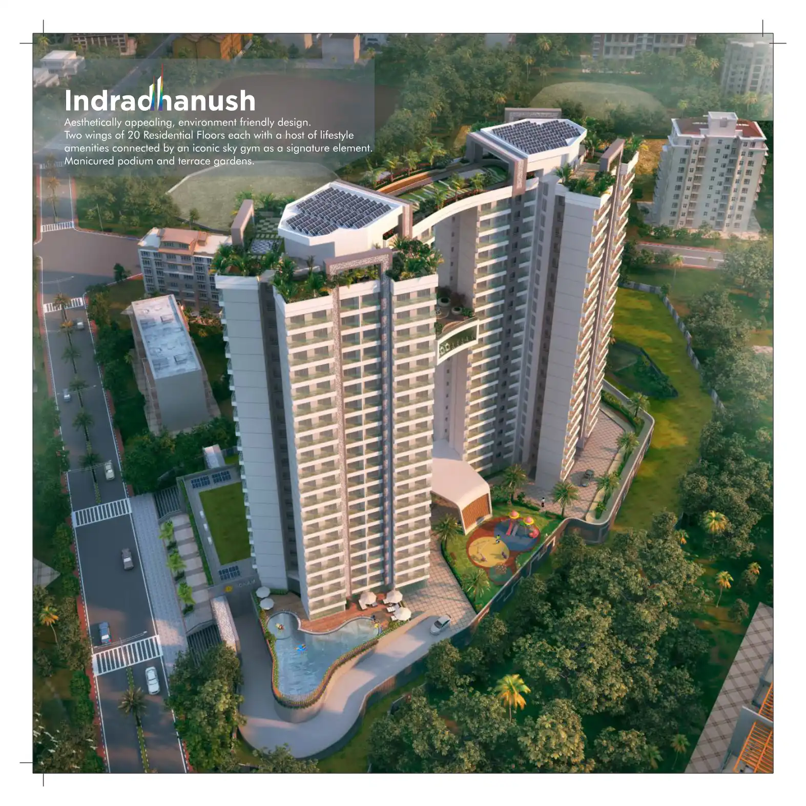 Aesthetically appealing, environment friendly design. Two wings of 20 Residential Floors each with a host of lifestyle amenities connected by an iconic sky gym as a signature element. Manicured podium and terrace gardens.