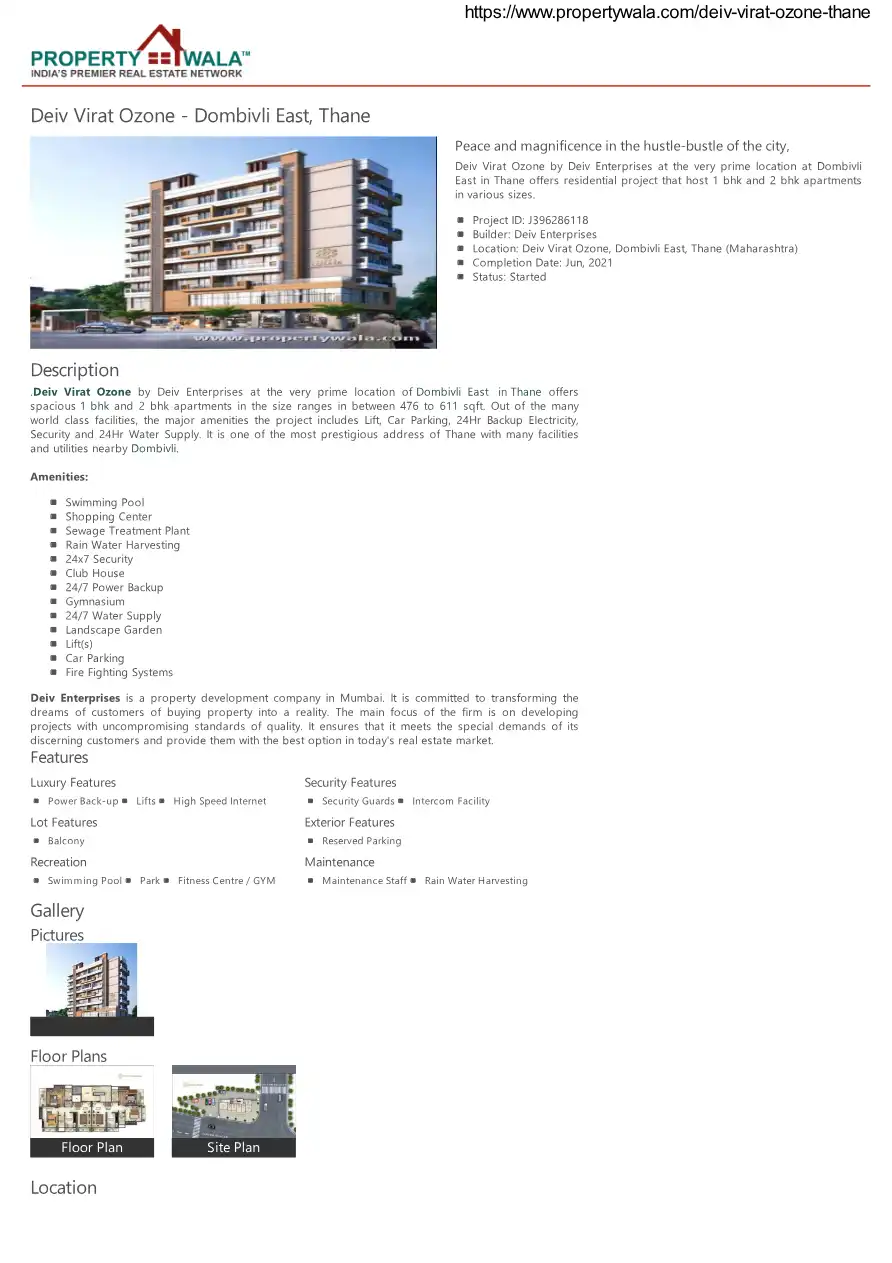 Deiv Virat Ozone by Deiv Enterprises at the very prime location of Dombivli East in Thane offers spacious 1 bhk and 2 bhk apartments in the size ranges in between 476 to 611 sqft. Out of the many world class facilities, the major amenities the projec...