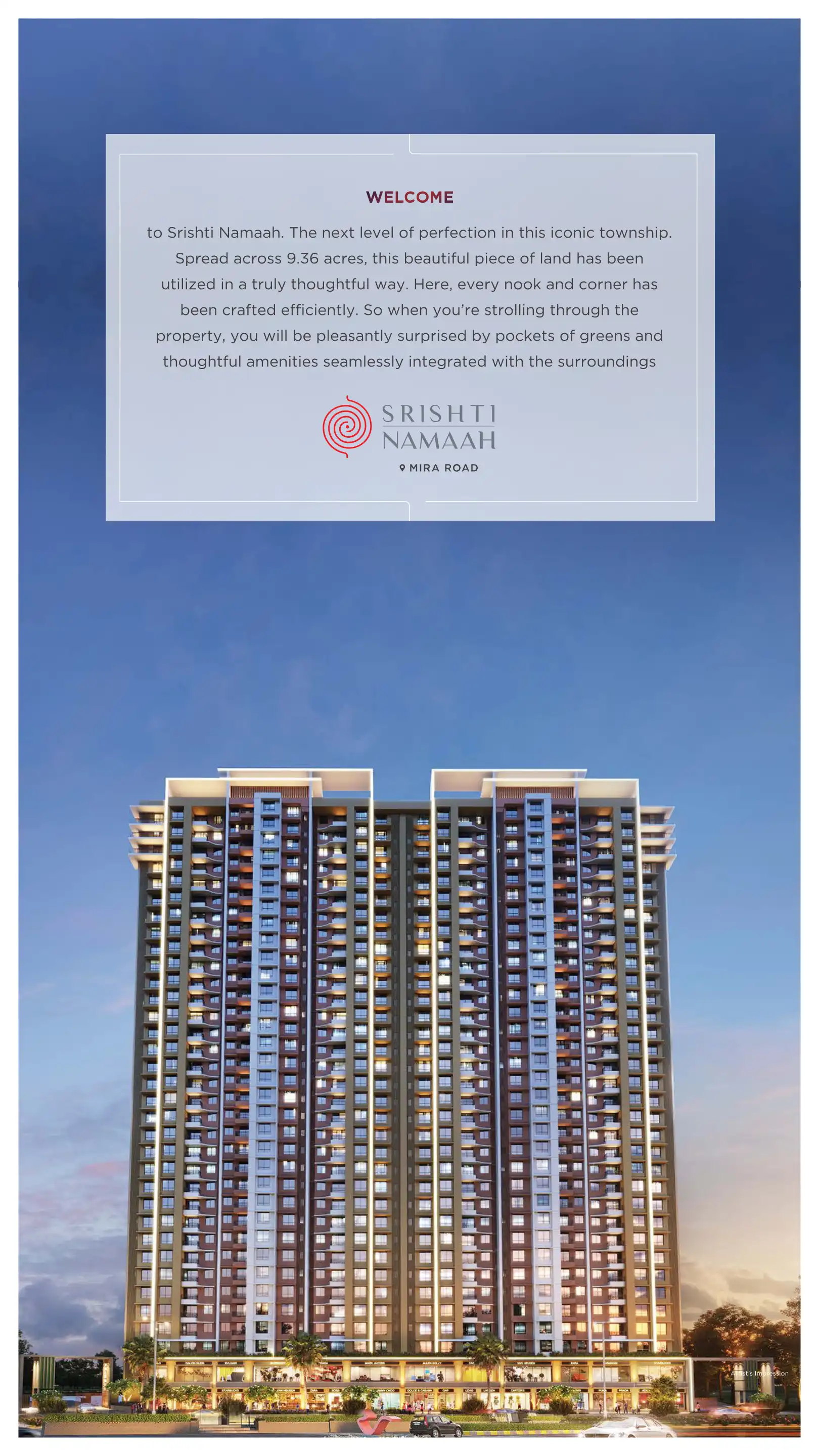 Welcome to Srishti Namaah. The next level of perfection in this iconic township. Spread across 9.36 acres, this beautiful piece of land has been utilized in a truly thoughtful way. Here, every nook and corner has been crafted efficiently.