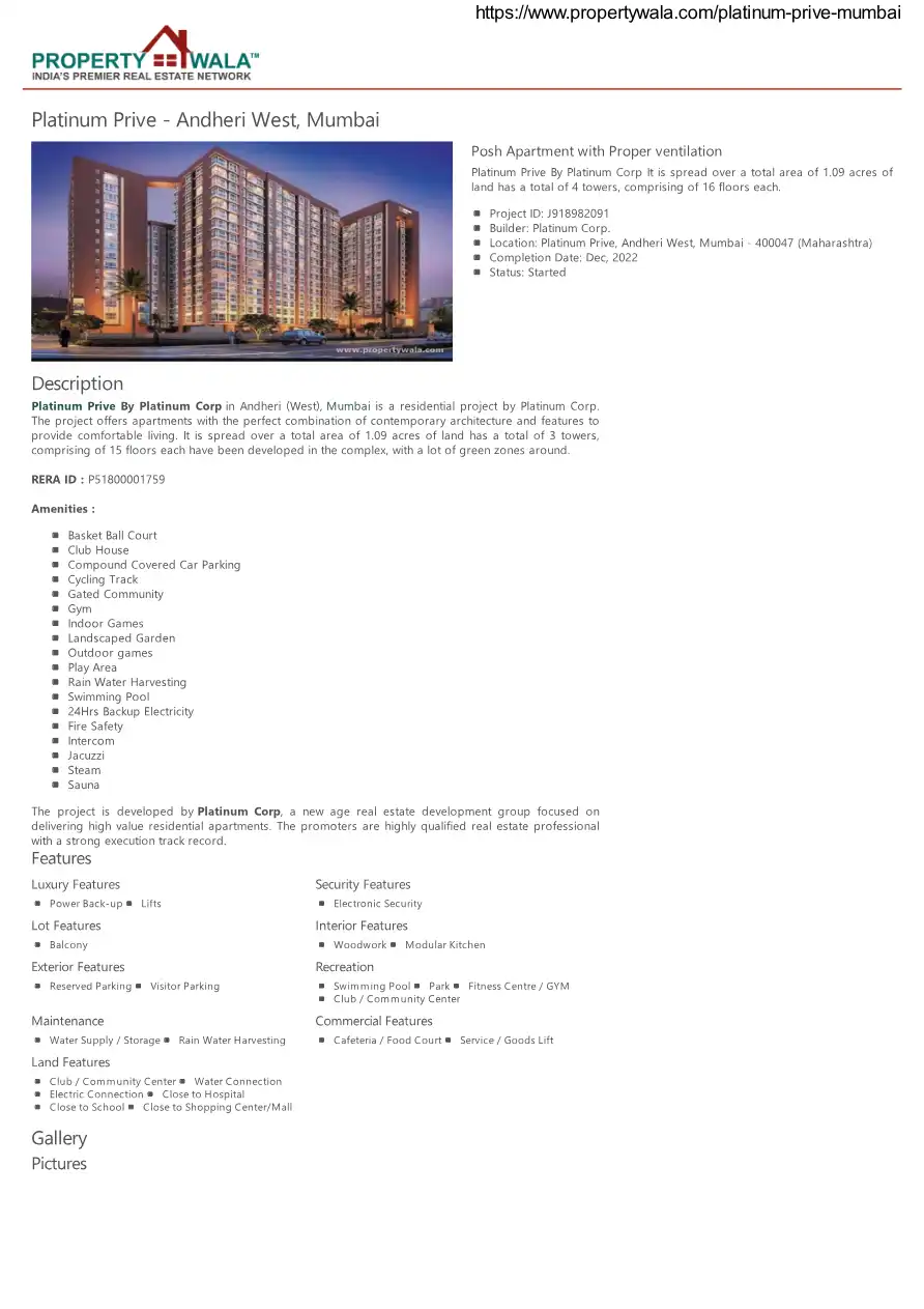 Platinum Prive By Platinum Corp in Andheri (West), Mumbai is a residential project by Platinum Corp. The project offers apartments with the perfect combination of contemporary architecture and features to provide comfortable living. It is spread over...