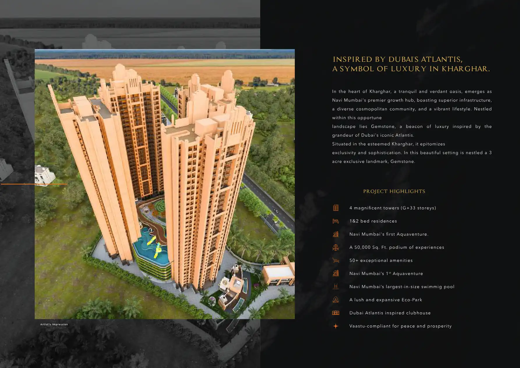Gemstone, a beacon of luxury inspired by the grandeur of Dubai's iconic Atlantis. Situated in the esteemed Kharghar, it epitomizes exclusivity and sophistication. In this beautiful setting is nestled a 3 acre exclusive landmark, Gemstone.