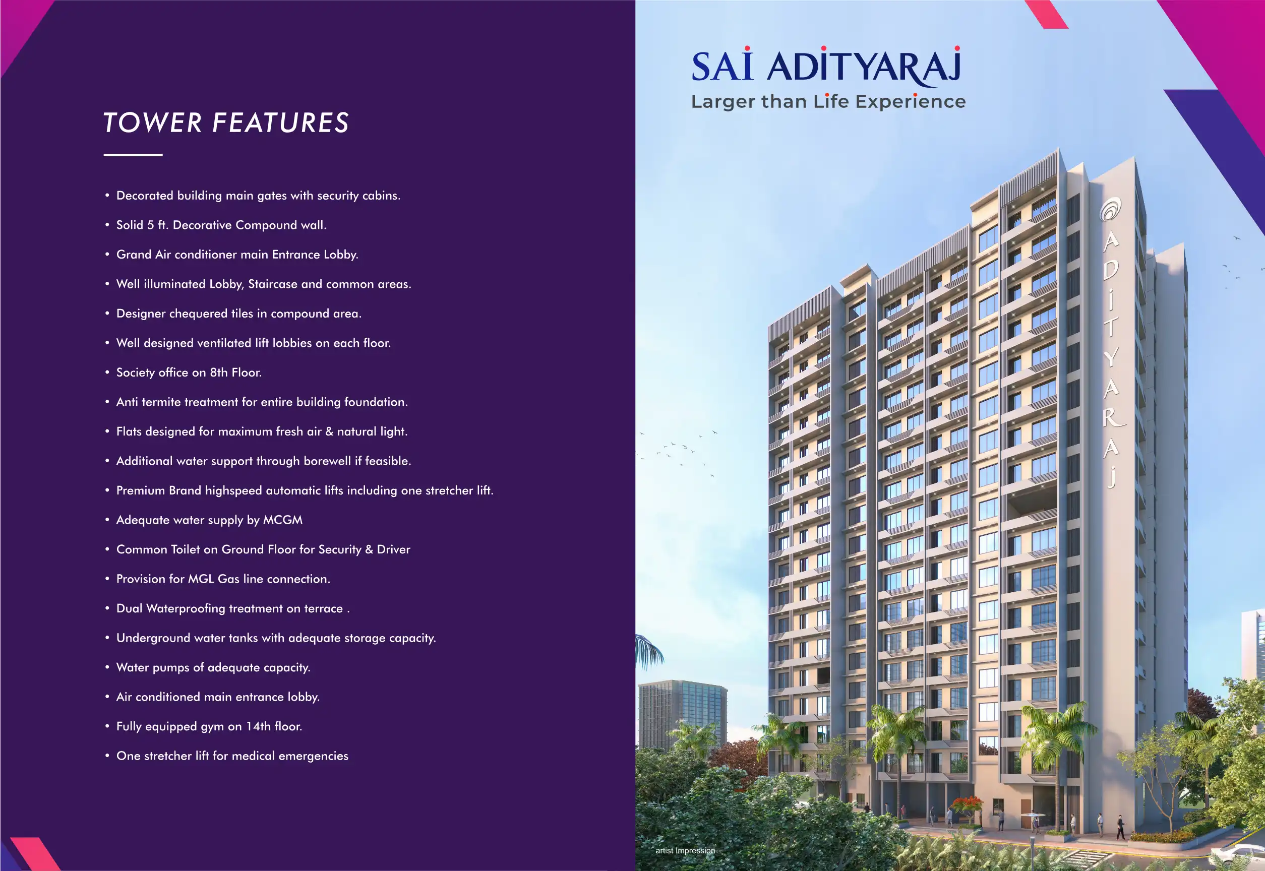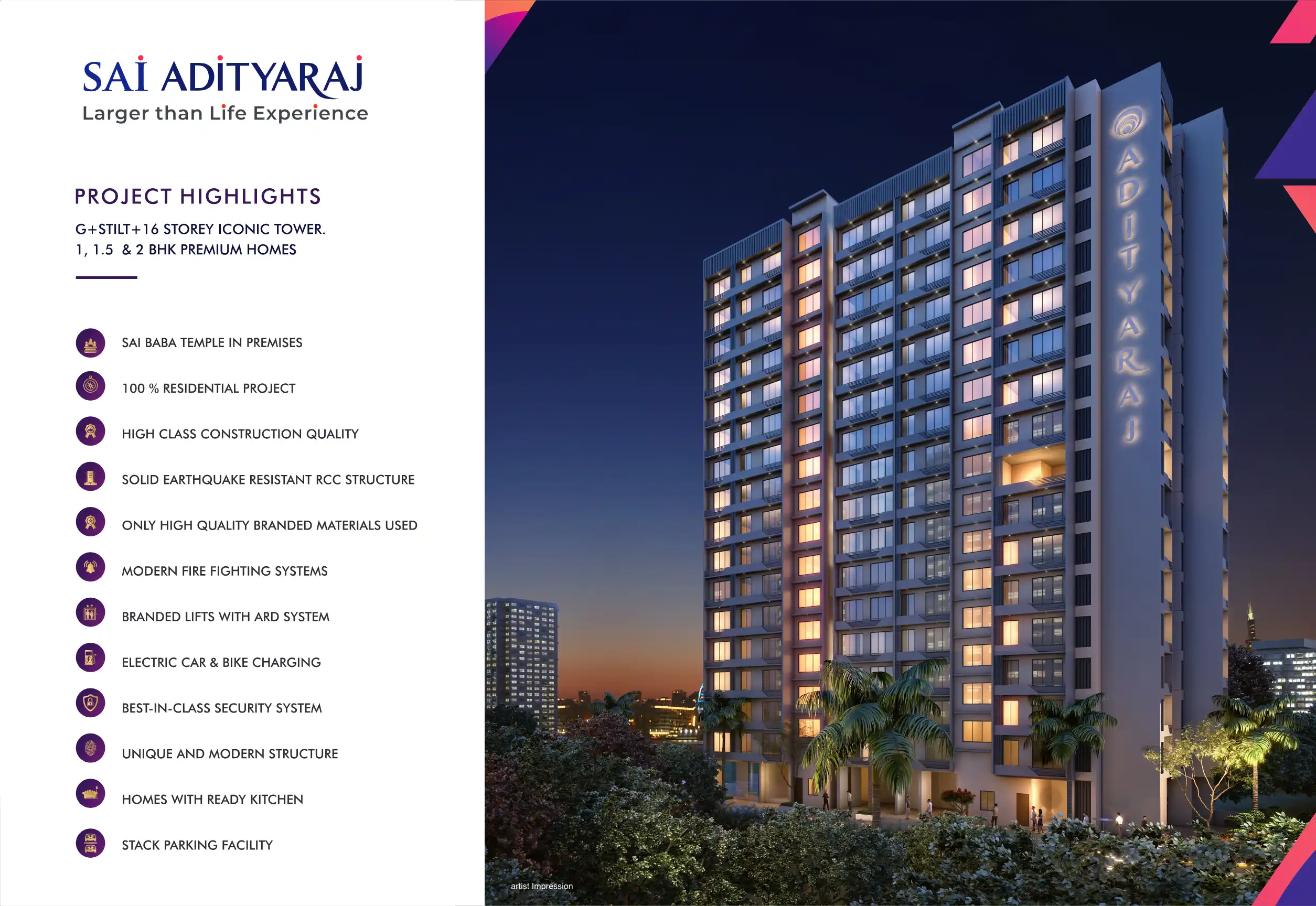 Sai Adityaraj offers premium 1, 1.5 & 2 BHK homes in Ghatkopar(E). The project boasts amenities like a Sai Baba temple, high-quality construction, earthquake-resistant RCC structure, branded lifts, and electric car charging.