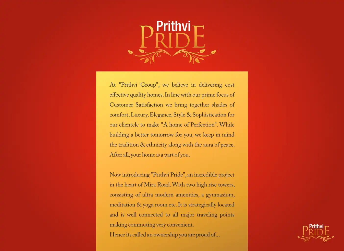 Now introducing "Prithvi Pride", an incredible project in the heart of Mira Road. With two high rise towers, consisting of ultra modern amenities, a gymnasium, meditation & yoga room etc. It is strategically located and is well connected to all major...