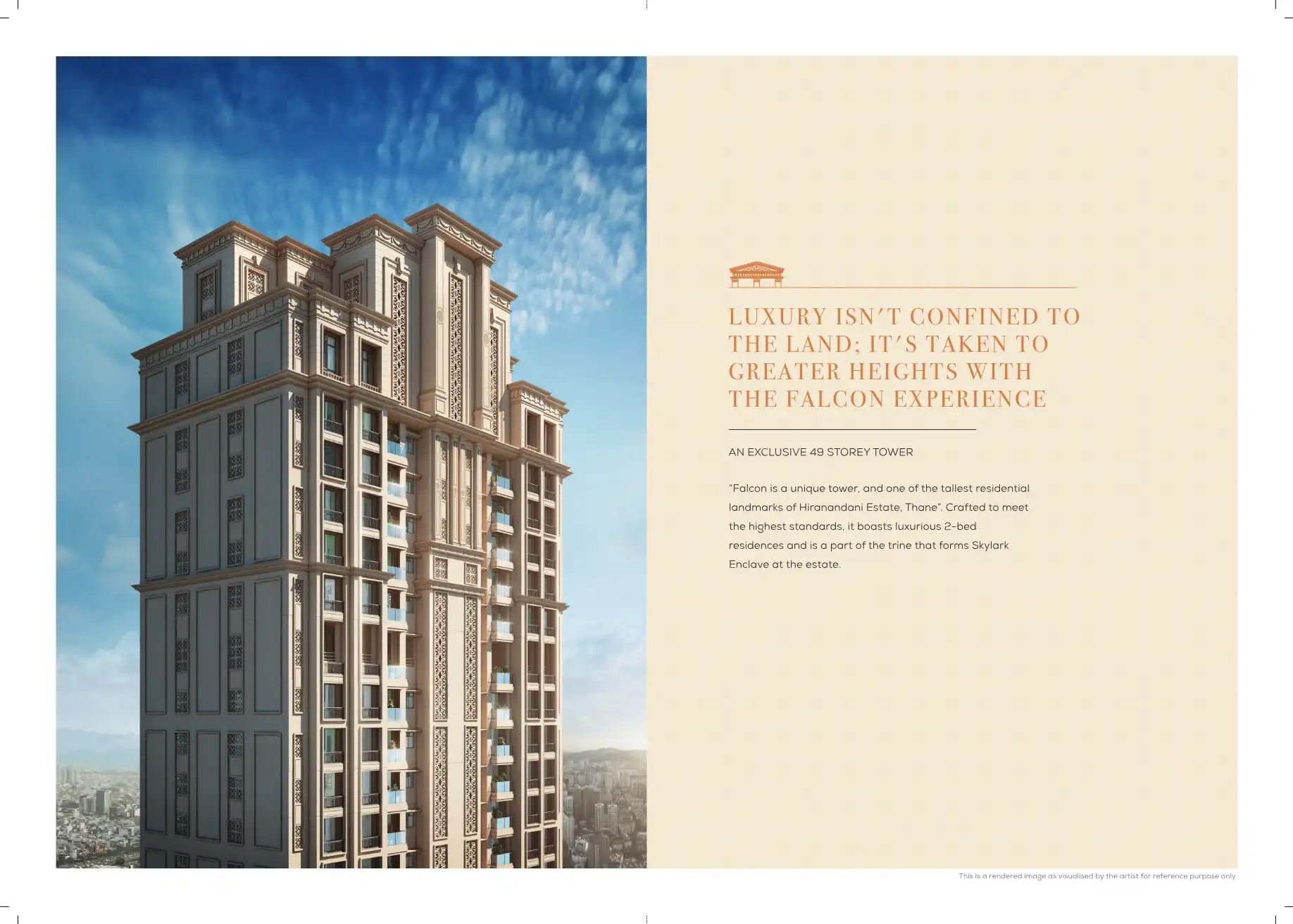 Falcon is a unique tower, and one of the tallest residential landmarks of Hiranandani Estate, Thane. Crafted to meet the highest standards, it boasts luxurious 2-bed residences and is a part of the trine that forms Skylark Enclave at the estate.