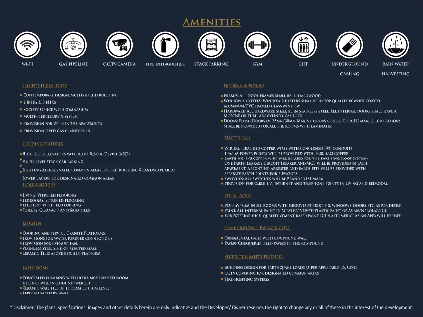 Contemporary design, multistoreied building with 2 and 3 BHK apartments. Society office with gymnasium, multi-tier security system, provision for wi-fi and piped gas connection.