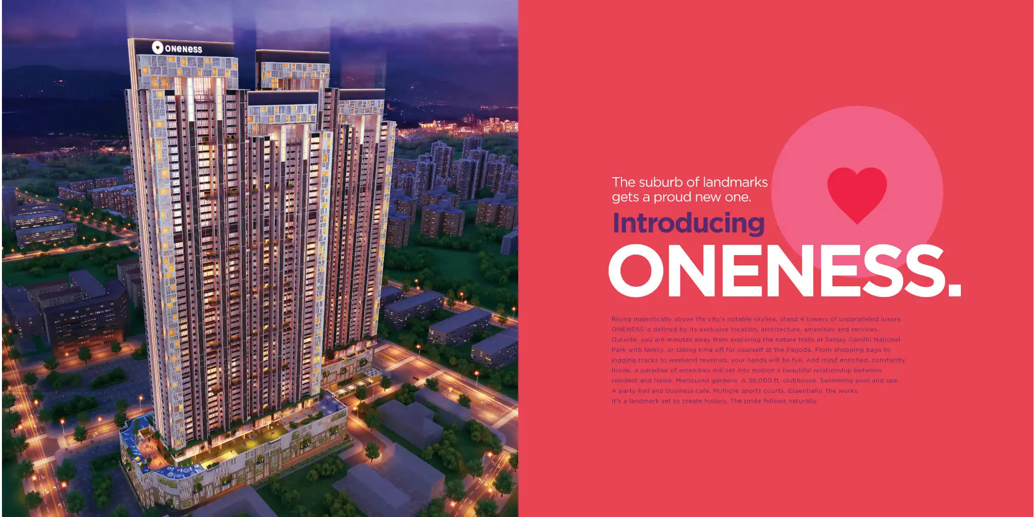 Introducing ONENESS. Rising majestically above the city's notable skyline, stand 4 towers of unparalleled luxury. ONENESS is defined by its exclusive location, architecture, amenities and services.