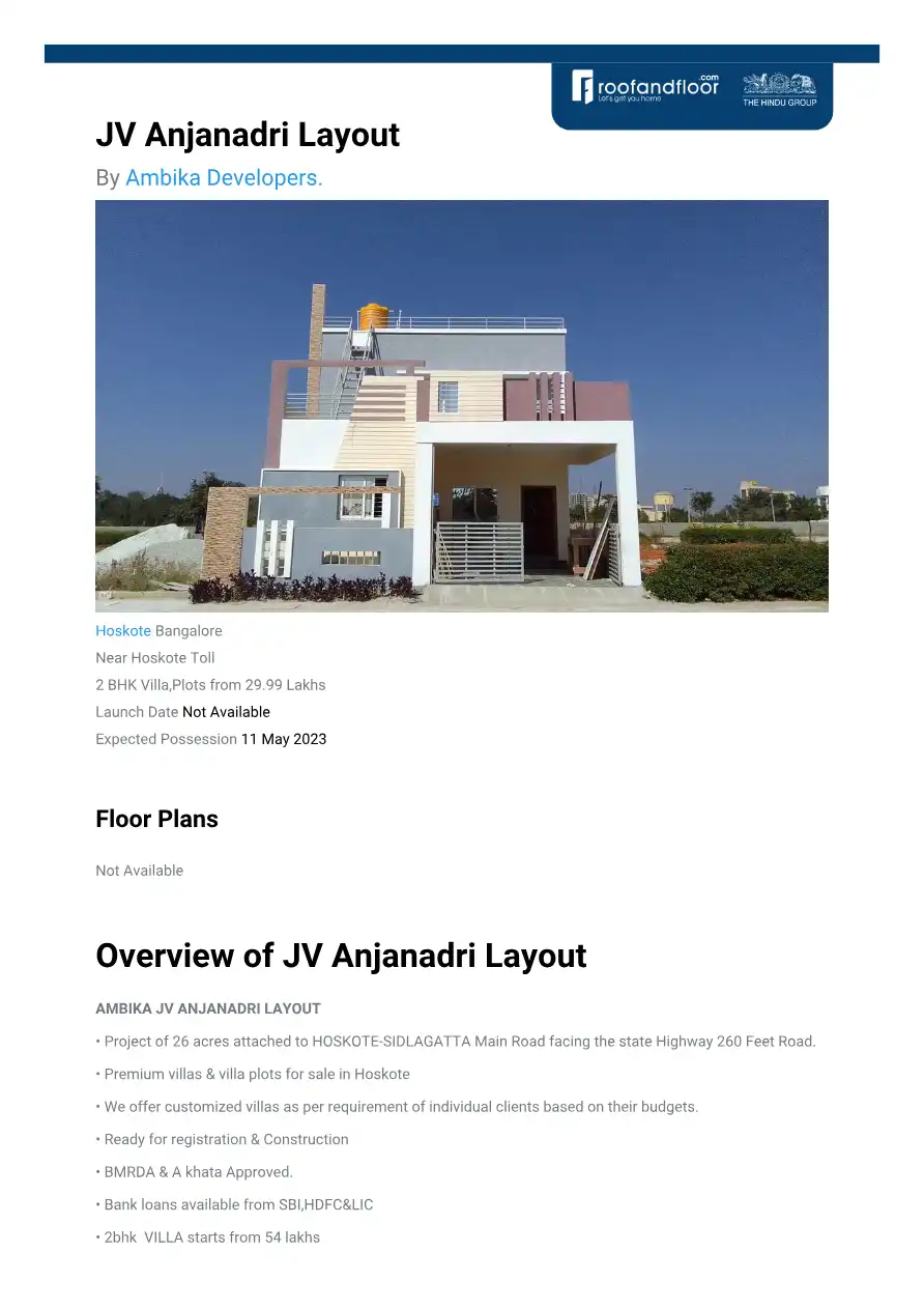AMBIKA JV ANJANADRI LAYOUT • Project of 26 acres attached to HOSKOTE-SIDLAGATTA Main Road facing the state Highway 260 Feet Road. • Premium villas & villa plots for sale in Hoskote • We offer customized villas as per requirement of individual clients...