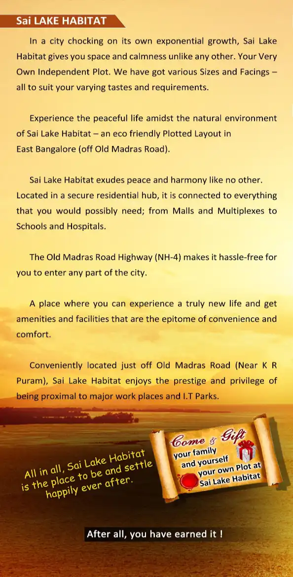 An eco friendly Plotted Layout in East Bangalore (off Old Madras Road). Located in a secure residential hub, it is connected to everything that you would possibly need; from Malls and Multiplexes to Schools and Hospitals.