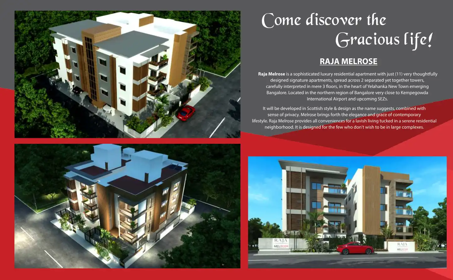 Raja Melrose is a sophisticated luxury residential apartment with just (11) very thoughtfully designed signature apartments, spread across 2 separated yet together towers, carefully interpreted in mere 3 floors, in the heart of Yelahanka New Town eme...