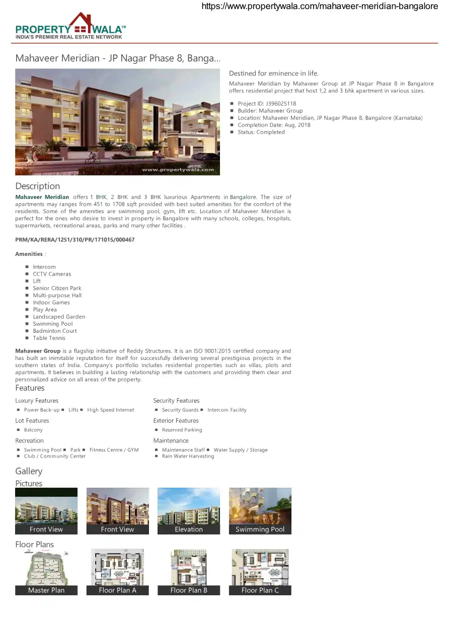Mahaveer Meridian offers 1 BHK, 2 BHK and 3 BHK luxurious Apartments in Bangalore. The size of apartments may ranges from 451 to 1708 sqft provided with best suited amenities for the comfort of the residents.