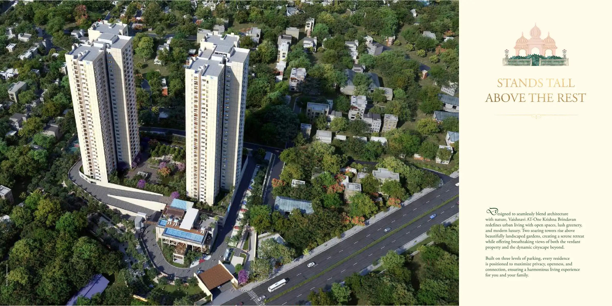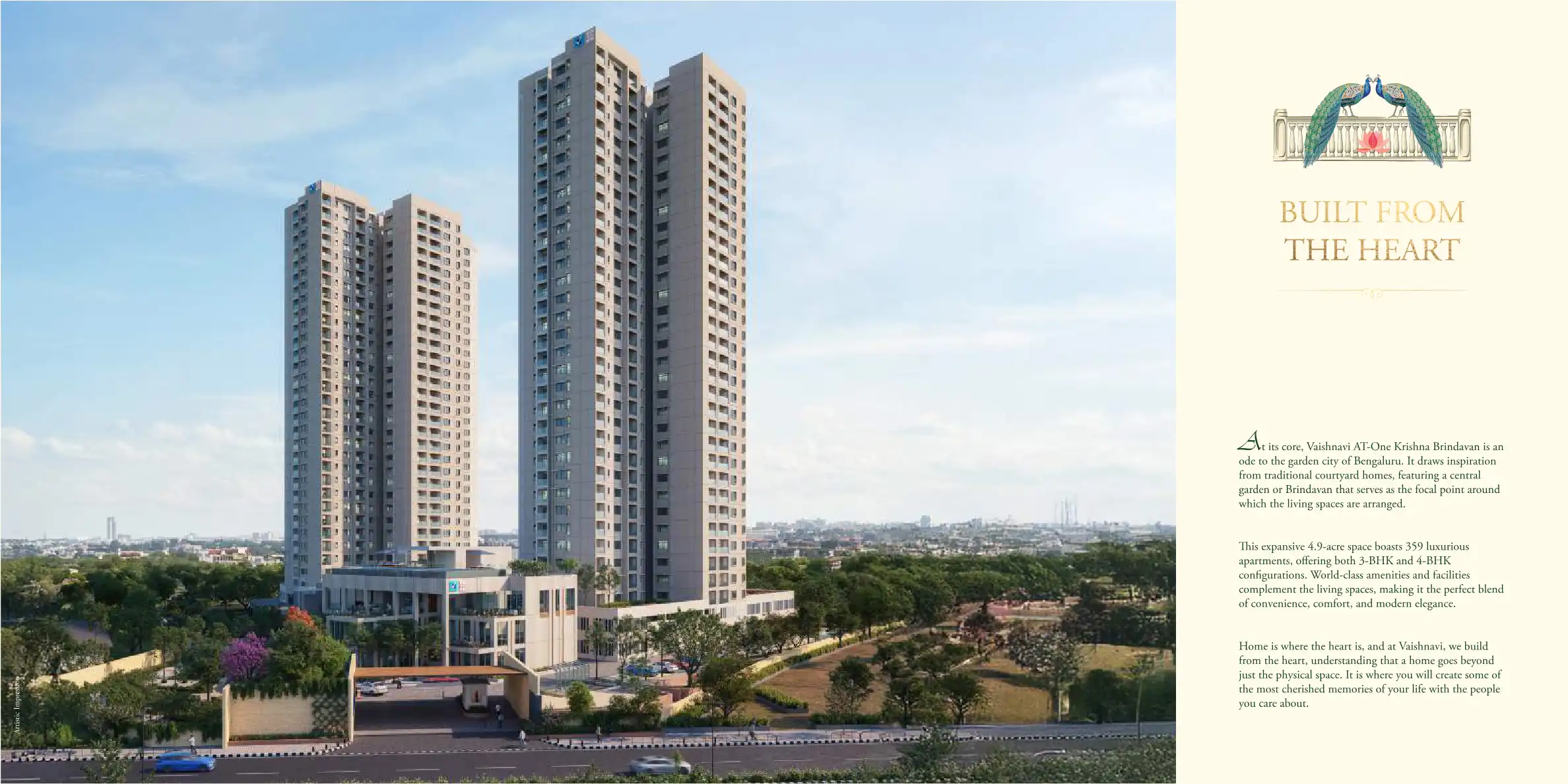 Vaishnavi AT-One Krishna Brindavan is an ode to the garden city of Bengaluru. It draws inspiration from traditional courtyard homes, featuring a central garden or Brindavan that serves as the focal point around which the living spaces are arranged.