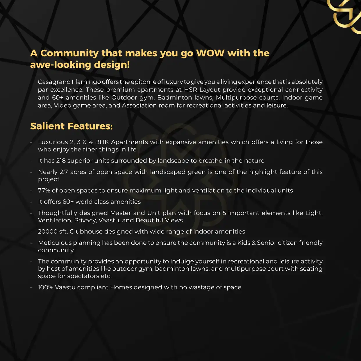 Casagrand Flamingo offers the epitome of luxury to give you a living experience that is absolutely par excellence. These premium apartments at HSR Layout provide exceptional connectivity and 60+ amenities like Outdoor gym, Badminton lawns, Multipurpo...