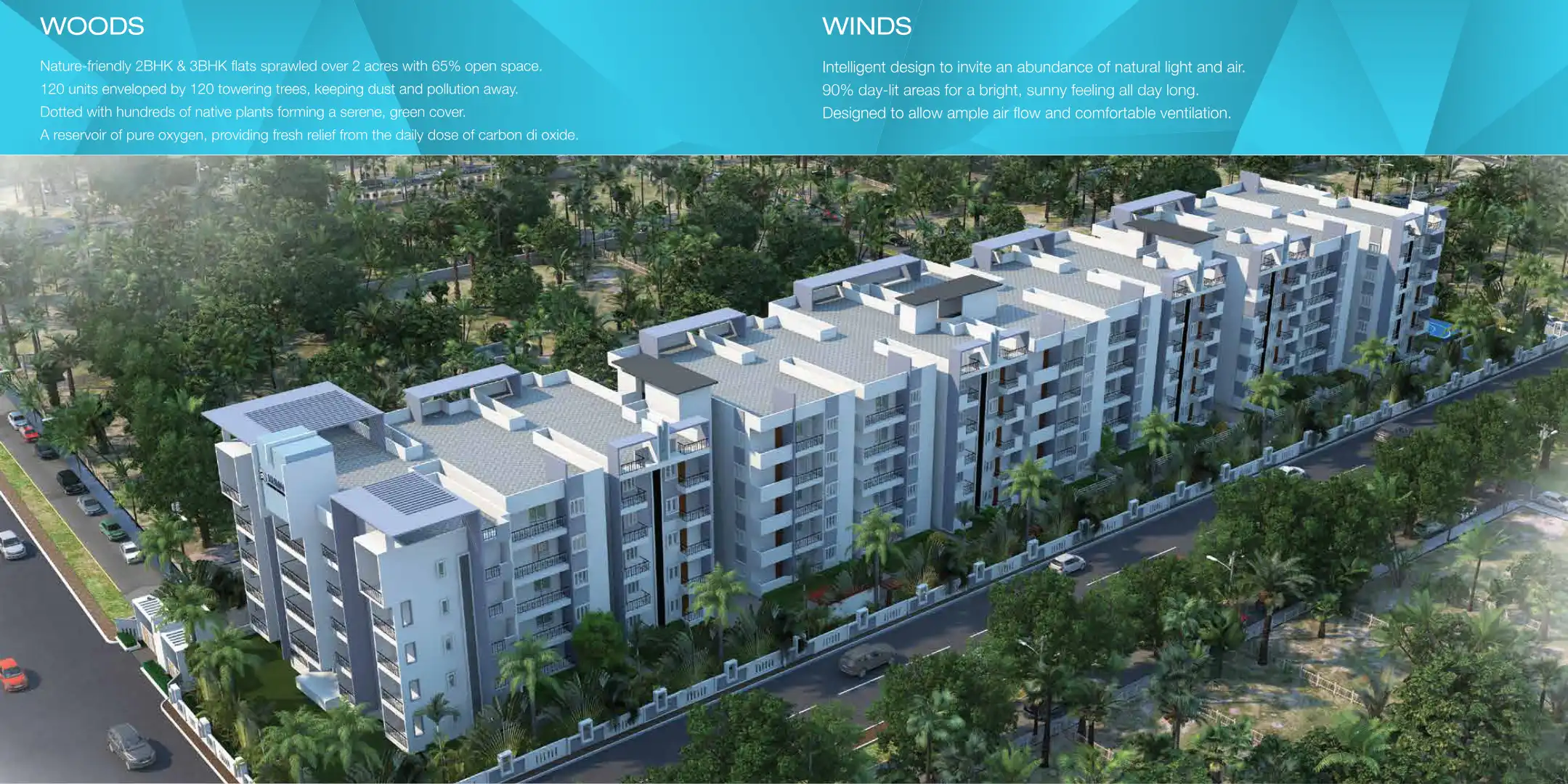 Nature-friendly 2BHK & 3BHK flats sprawled over 2 acres with 65% open space. 120 units enveloped by 120 towering trees, keeping dust and pollution away. Dotted with hundreds of native plants forming a serene, green cover. A reservoir of pure oxygen, ...
