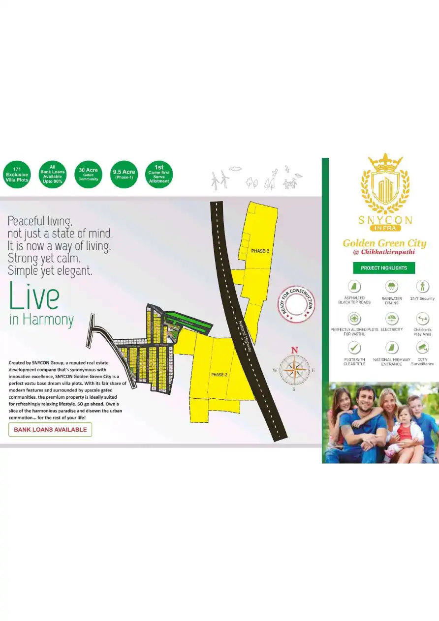SNYCON Golden Green City is a perfect vastu base dream villa plots. With its fair share of modern features and surrounded by upscale gated communities, the premium property is ideally suited for refreshingly relaxing lifestyle.