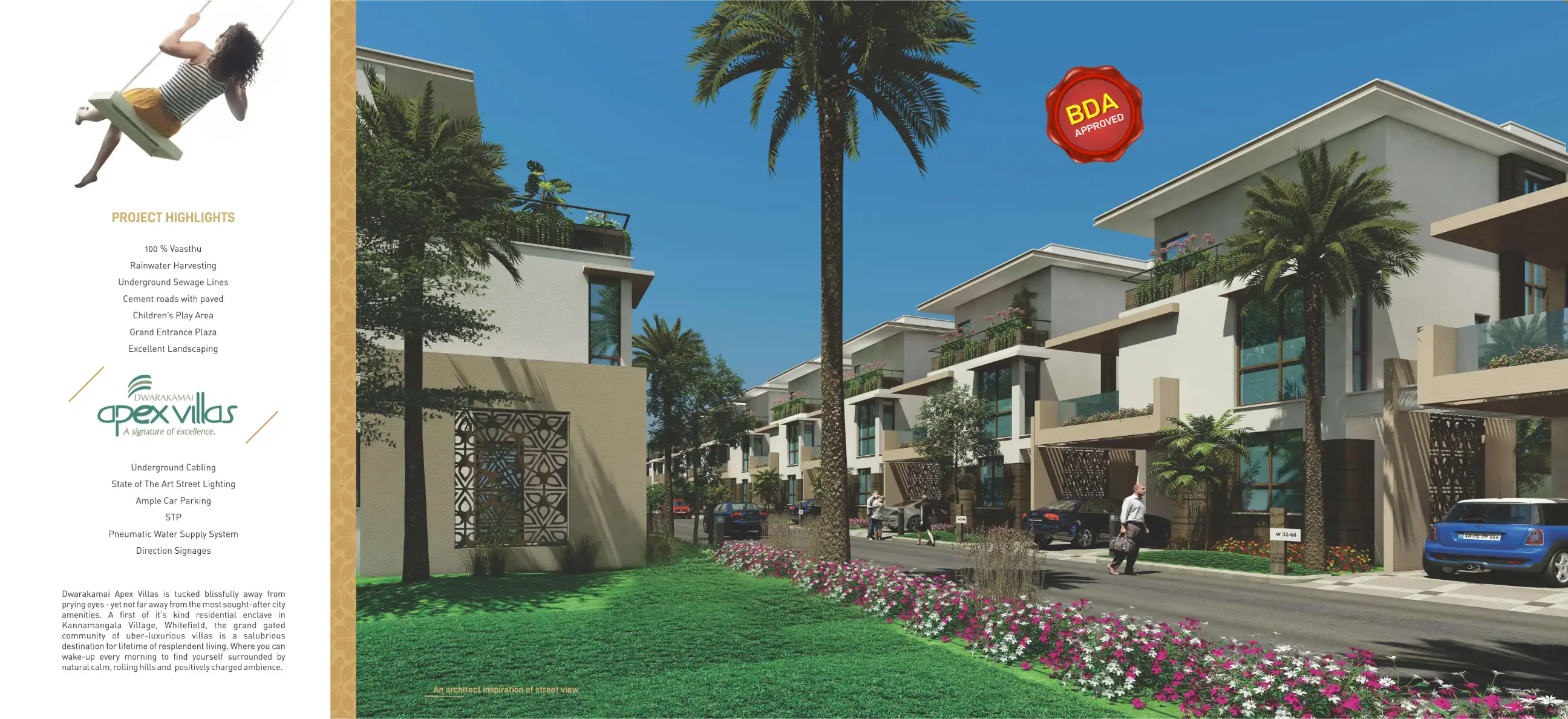 Dwarakamai Apex Villas is tucked blissfully away from prying eyes - yet not far away from the most sought-after city amenities. A first of it's kind residential enclave in Kannamangala Village, Whitefield, the grand gated community of uber-luxurious ...