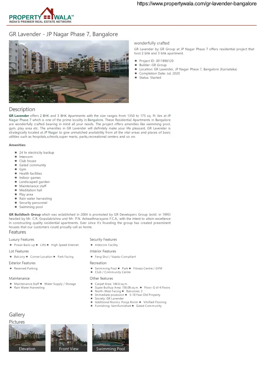 GR Lavender offers 2 BHK and 3 BHK Apartments with the size ranges from 1350 to 175 sq. Ft. lies at JP Nagar Phase 7 which is one of the prime locality in Bangalore. These Residential Apartments in Bangalore are wonderfully crafted bearing in mind al...