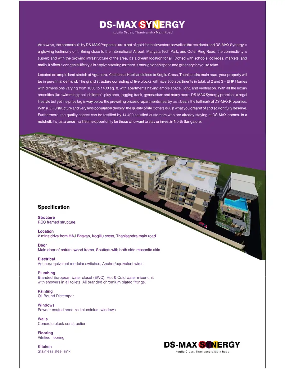 DS-MAX Synergy offers 2 and 3-BHK luxury apartments with best-in-class amenities. The grand structure consisting of five blocks will have 360 apartments in total, of 2 and 3 – BHK Homes with dimensions varying from 1000 to 1400 sq. ft. with apartment...