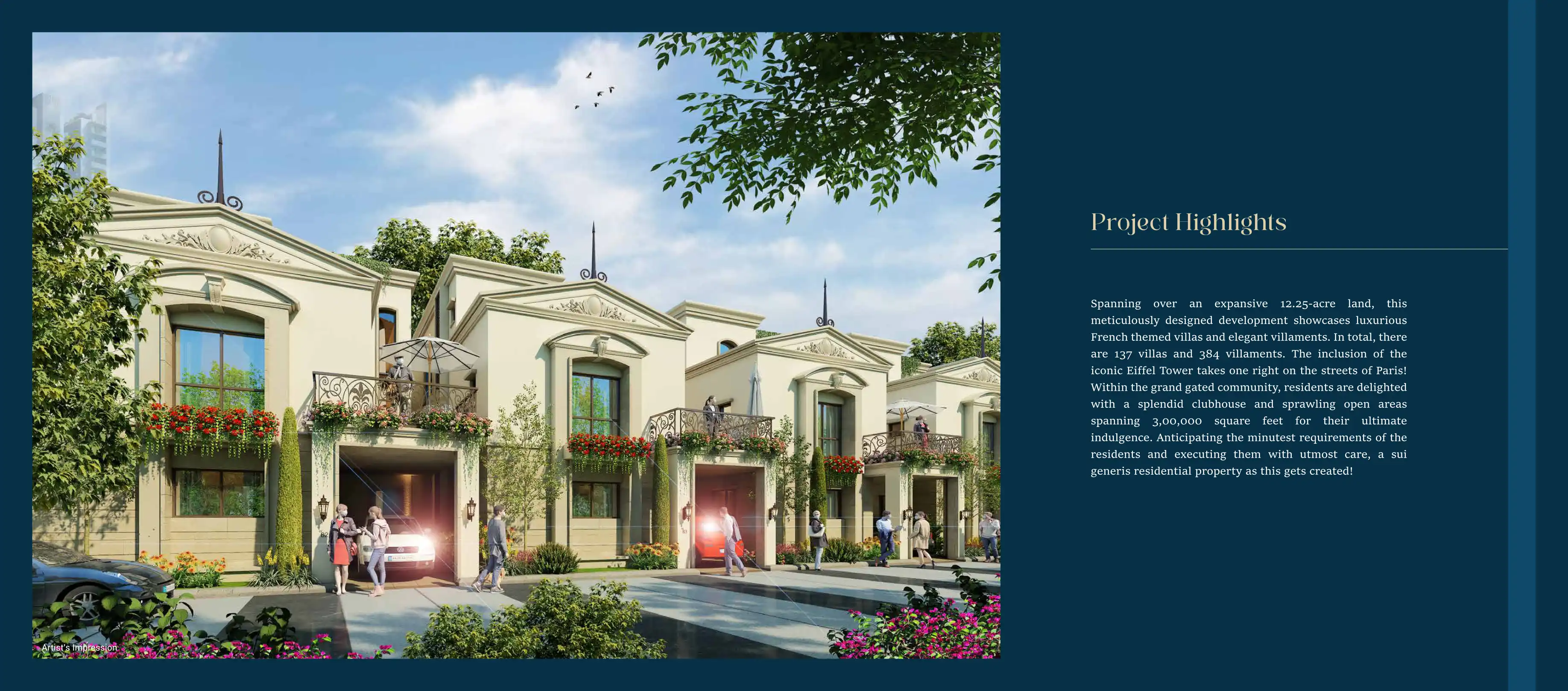 Spanning over an expansive 12.25-acre land, this meticulously designed development showcases luxurious French themed villas and elegant villaments. In total, there are 137 villas and 384 villaments. The inclusion of the iconic Eiffel Tower takes one ...