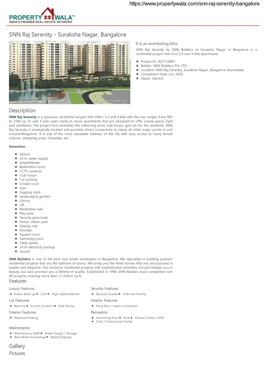 SNN Raj Serenity is a luxurious residential project that offers 2,3 and 4 bhk with the size ranges from 905 to 2180 sq. Ft. and 3 side open ready to move apartments that are designed to offer ample space, light and ventilation. The project host ameni...