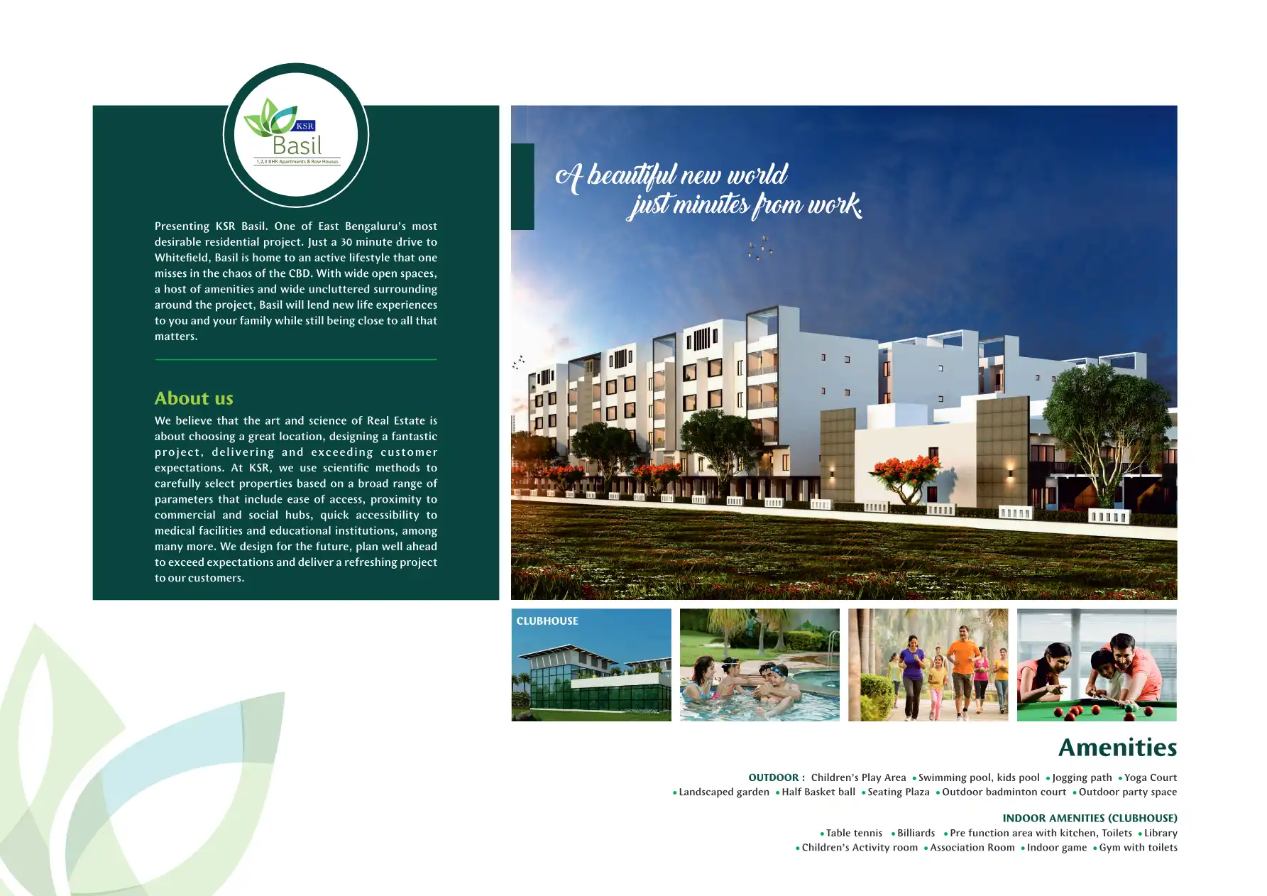 One of East Bengaluru's most desirable residential project. Just a 30 minute drive to Whitefield, Basil is home to an active lifestyle that one misses in the chaos of the CBD. With wide open spaces, a host of amenities and wide uncluttered surroundin...